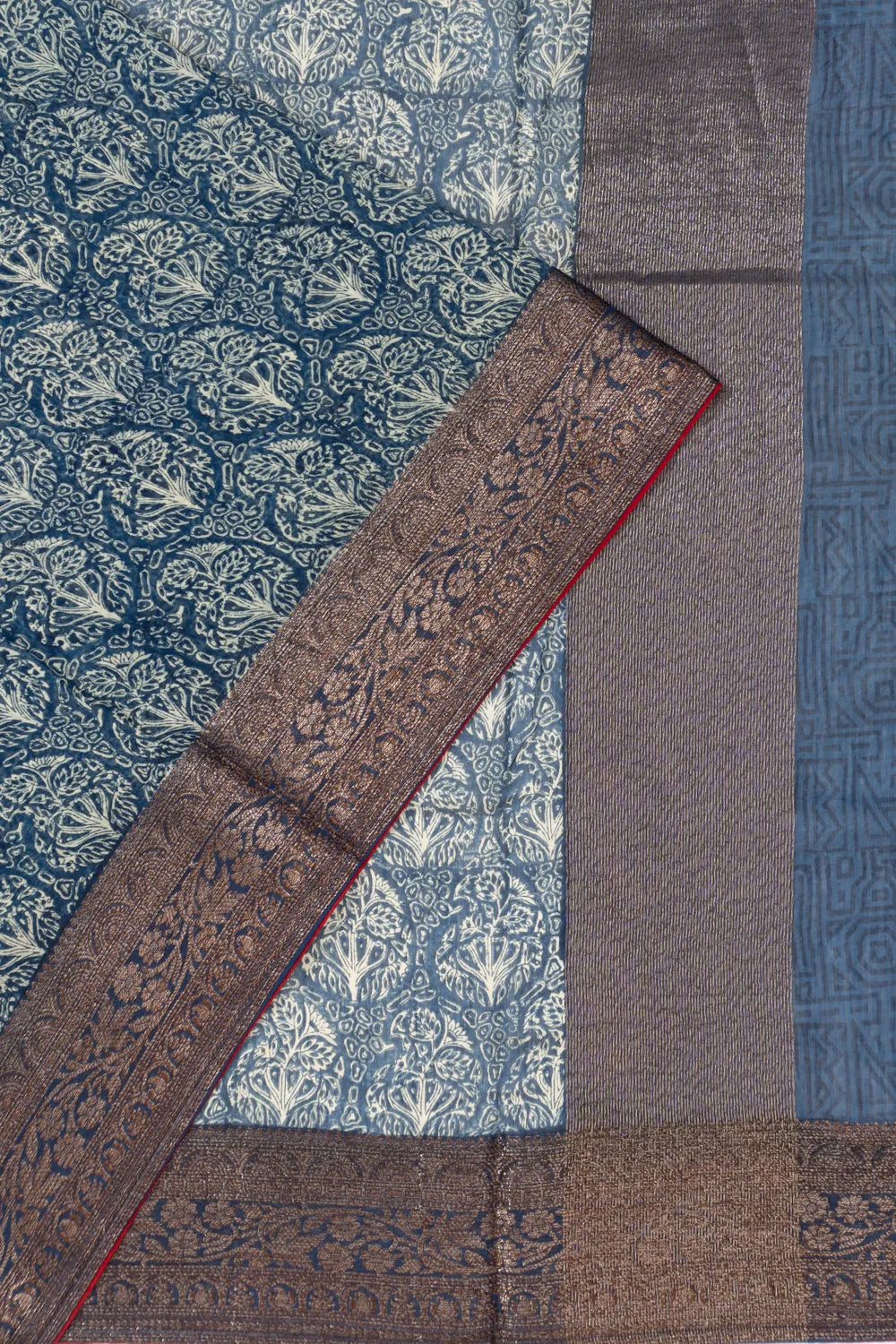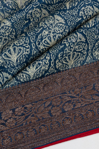 A Indigo Blue Chanderi Cotton saree with floral batik prints, giving the fabric a rich, artistic feel.
