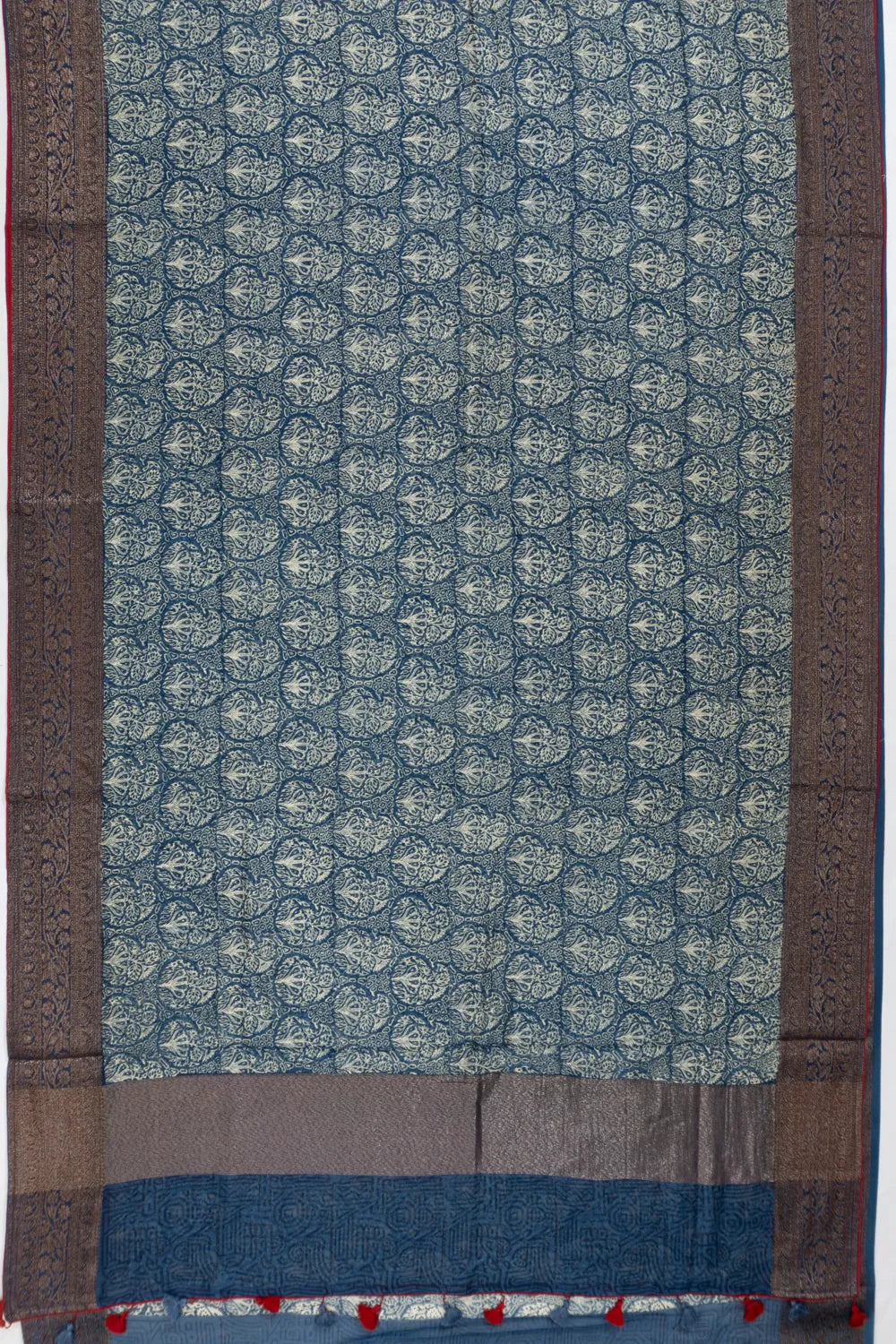 Self batik printed pallu with tassels, offering a modern twist and a playful, free-spirited finish.