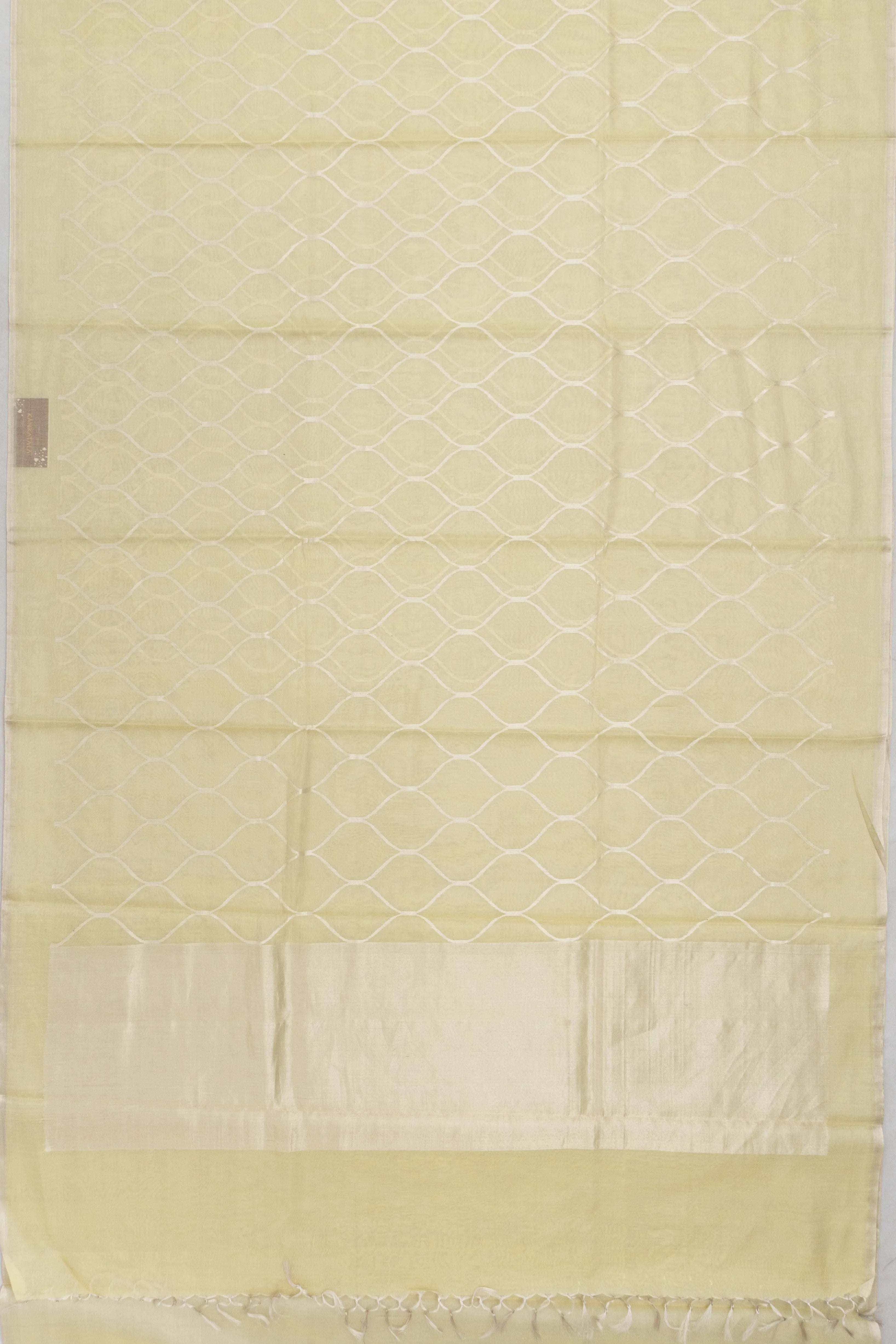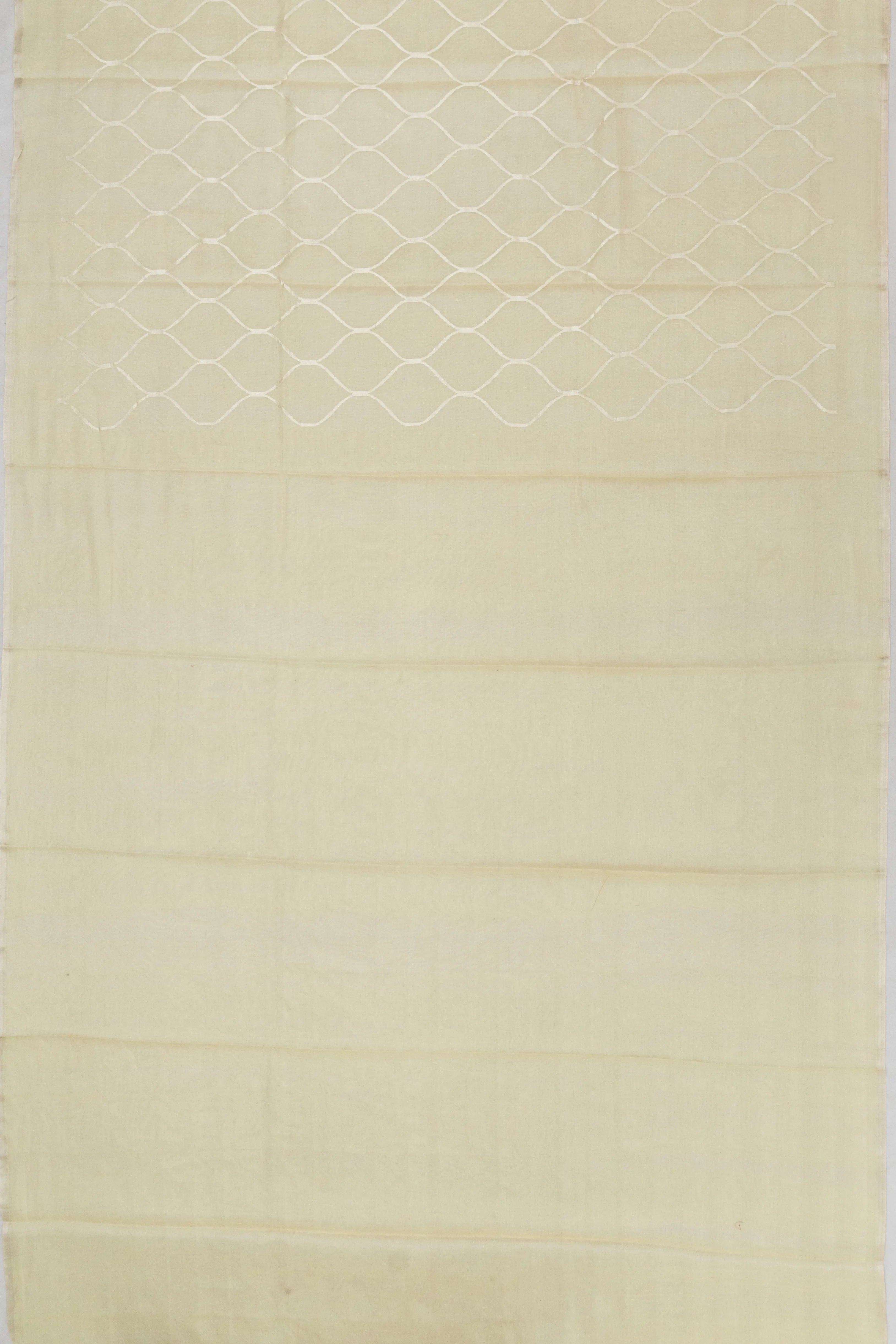Embrace the serene beauty of tradition with the Cotton By Tussar Tissue Jaal Lemon Yellow Saree, a masterpiece of heritage craftsmanship The body is adorned with a delicate silver zari floral jaal, creating an elegant tapestry of shimmering motifs against the soft lemon yellow backdrop