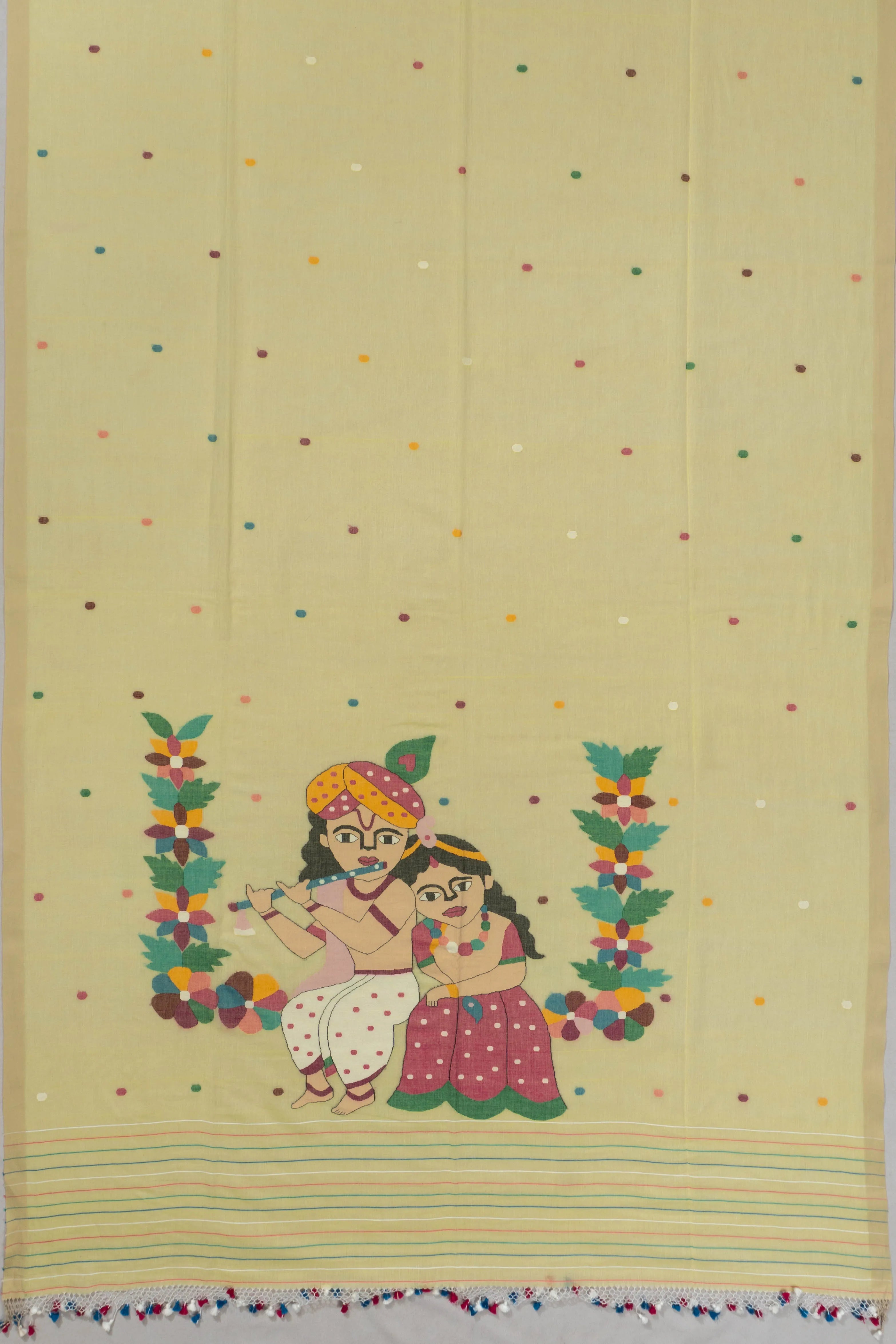 The pallu is a masterpiece, featuring a self Jamdani weave that narrates the enchanting story of Lord Radha and Krishna, highlighting the intricate craftsmanship and cultural richness