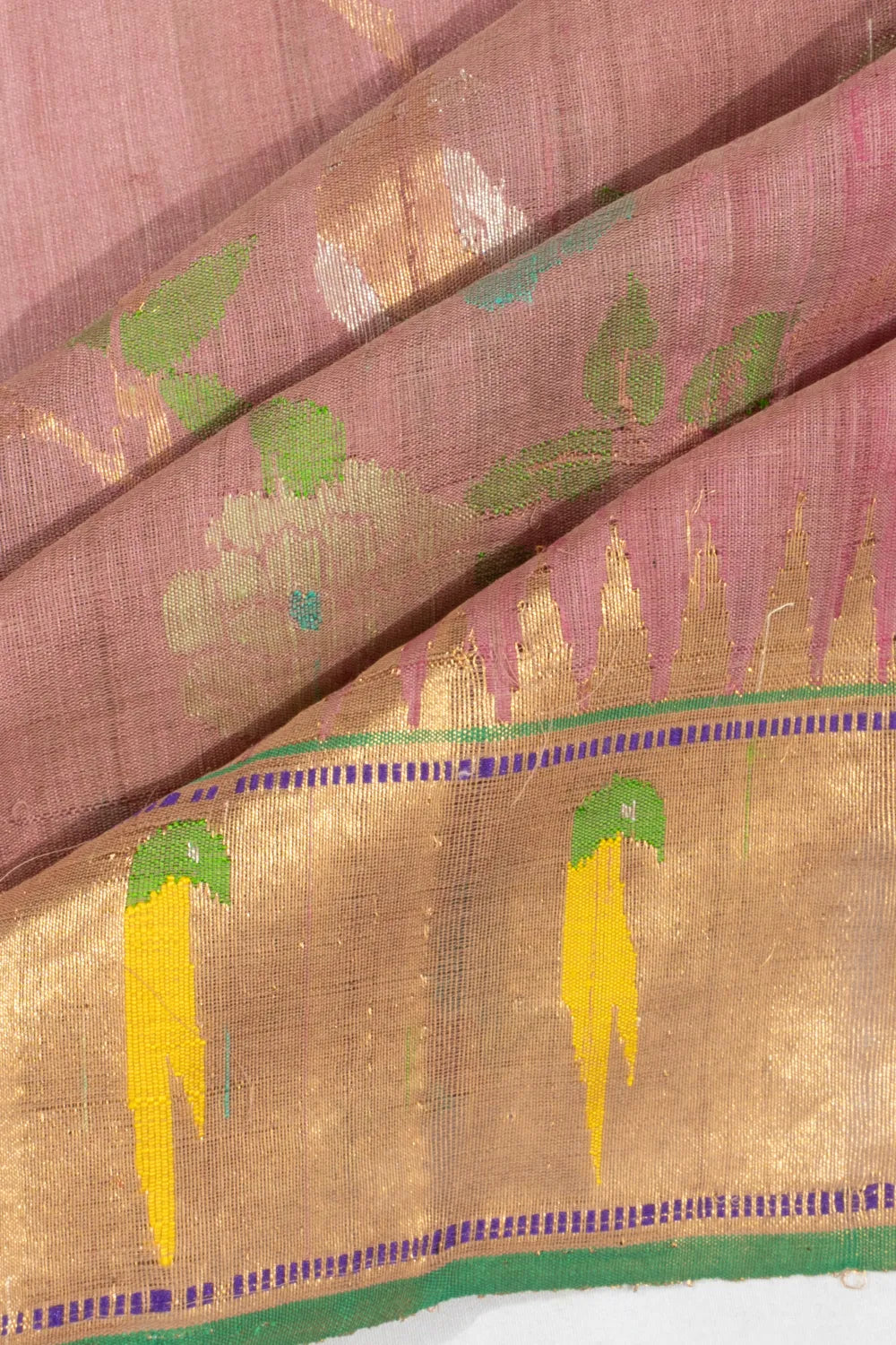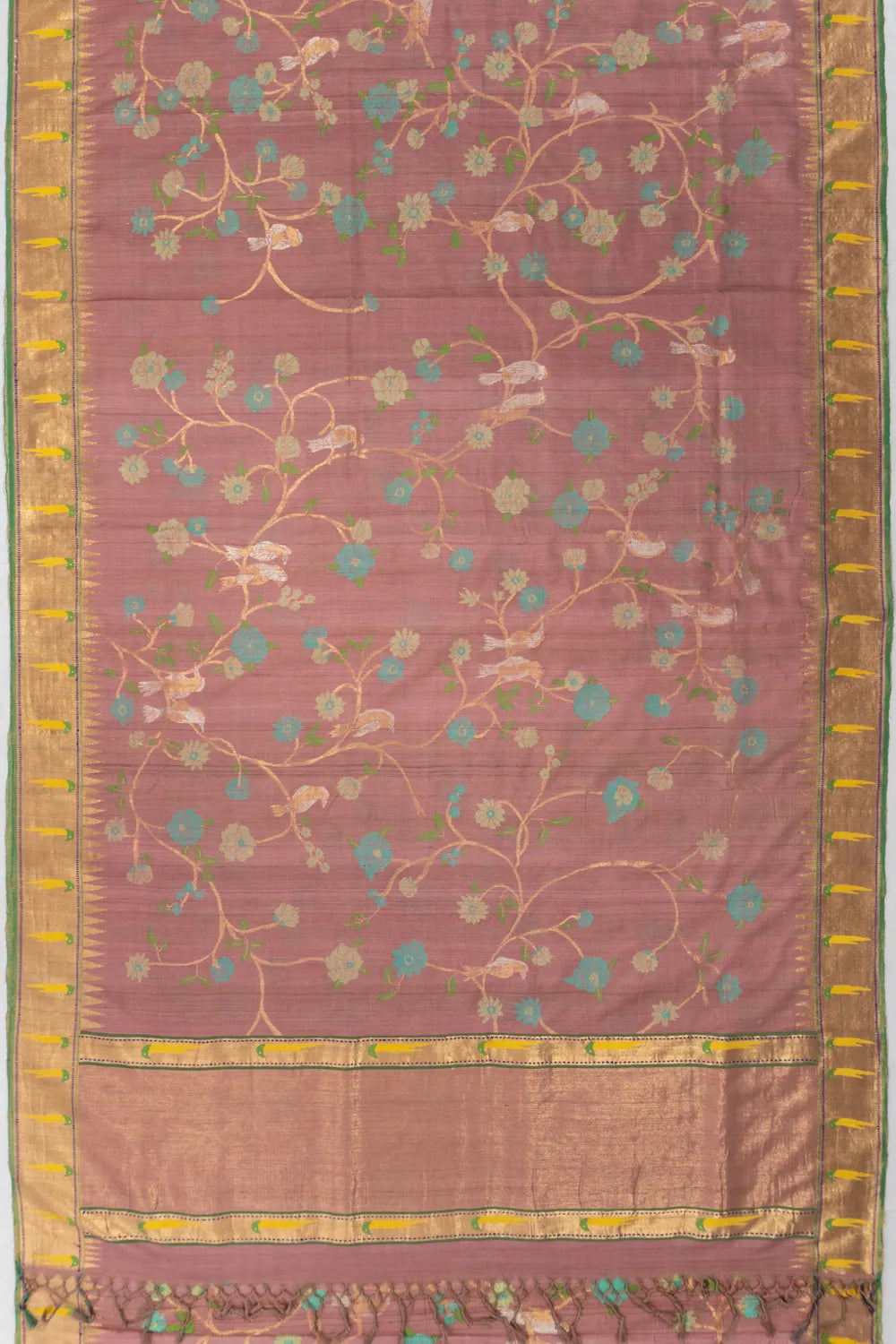 A contrast gold zari tissue border, inspired by Paithani aesthetics, embellished with charming Muniya motifs.