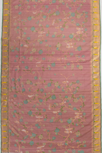 Draped in soft lavender ponduru tussar, the body features all-over floral Jamdani weaving interspersed with delicate bird motifs—each motif skillfully hand-inlaid, showcasing a narrative of nature in motion through this intricate weaving tradition.