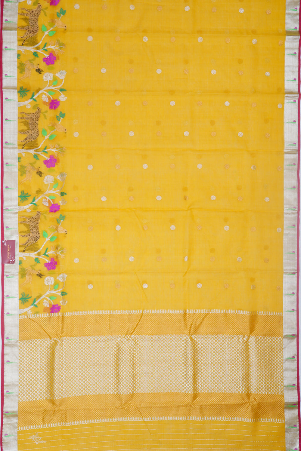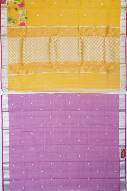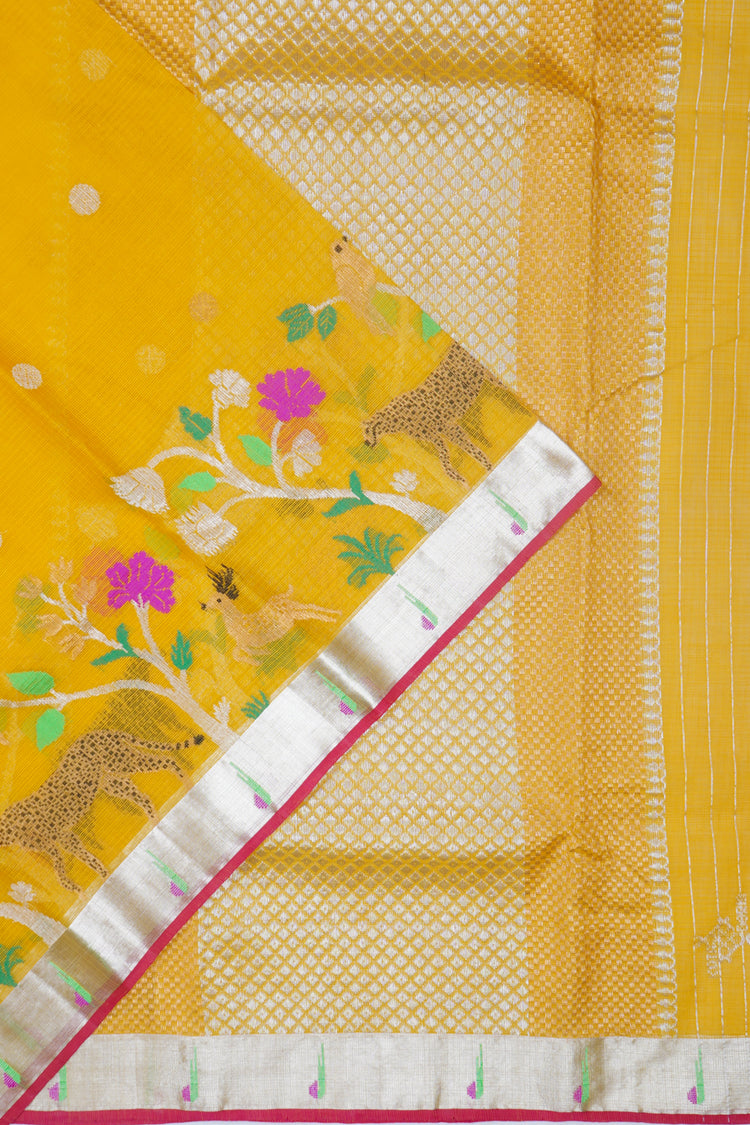 This exquisite handloom saree features a vibrant mustard yellow body adorned with traditional Butta patterns, perfectly complemented by a contrast Zari border of a small size Handpicked with meticulous care, just as Kankatala has done since 1943, this saree is ideal for weddings and special occasions, reflecting the brand's legacy of quality and dedication to India's rich weaving heritage