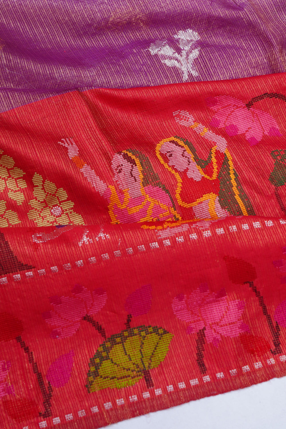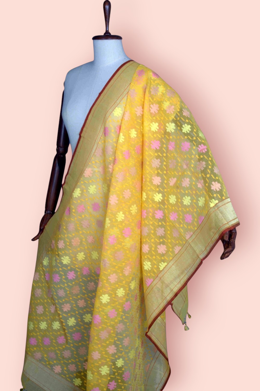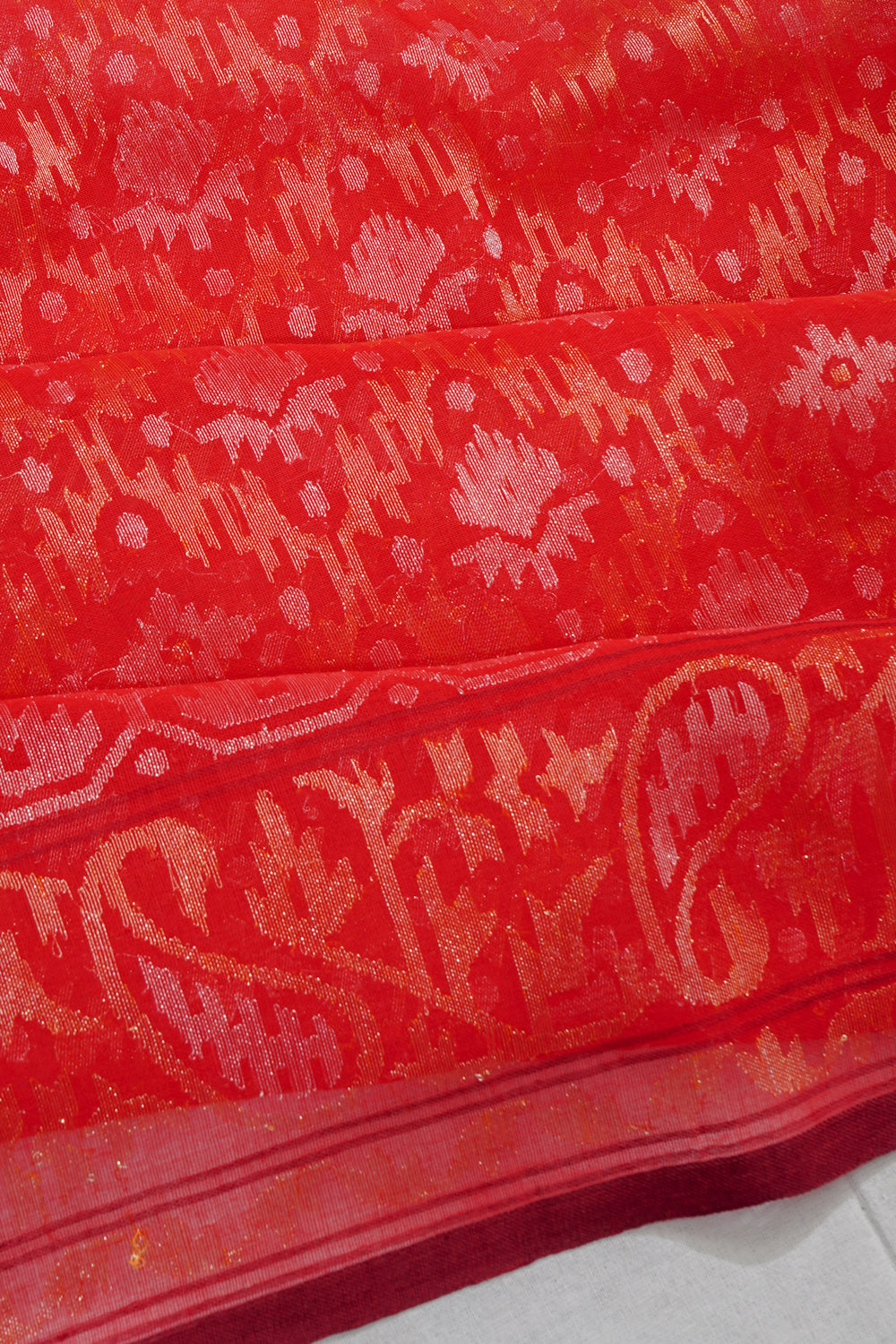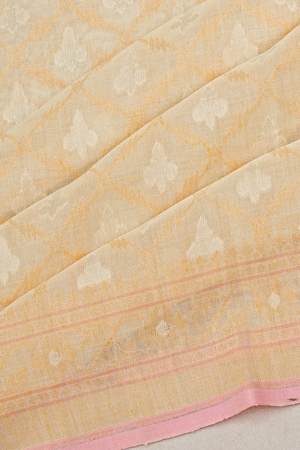 The handloom method involved making saree fabrics on traditional looms with the help of threads made out of raw cotton. This raw cotton was first cleaned and processed into threads, which were used to weave into a dazzling array of colours and patterns in different weights.