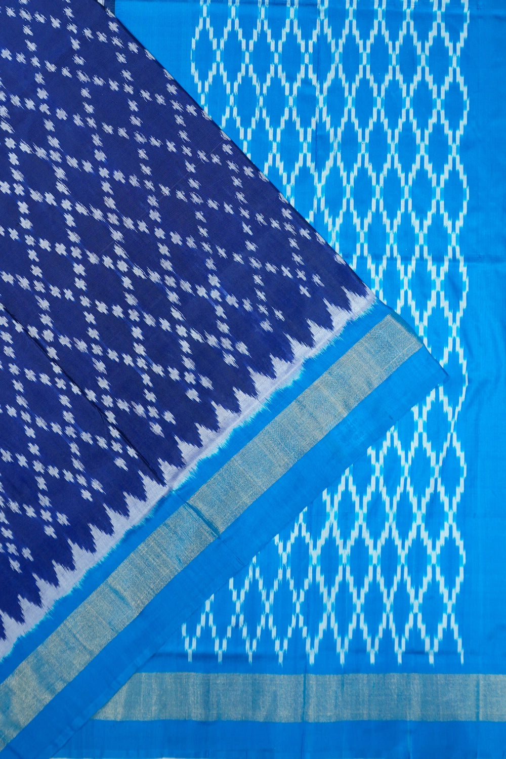 Immerse yourself in the rich heritage of Indian textiles with the Pochampally Silk Ikat Blue Saree, a masterpiece that celebrates traditional artistry The body of this saree is adorned with exquisite ikat patterns, showcasing the intricate skill and vibrant creativity synonymous with Pochampally weaving