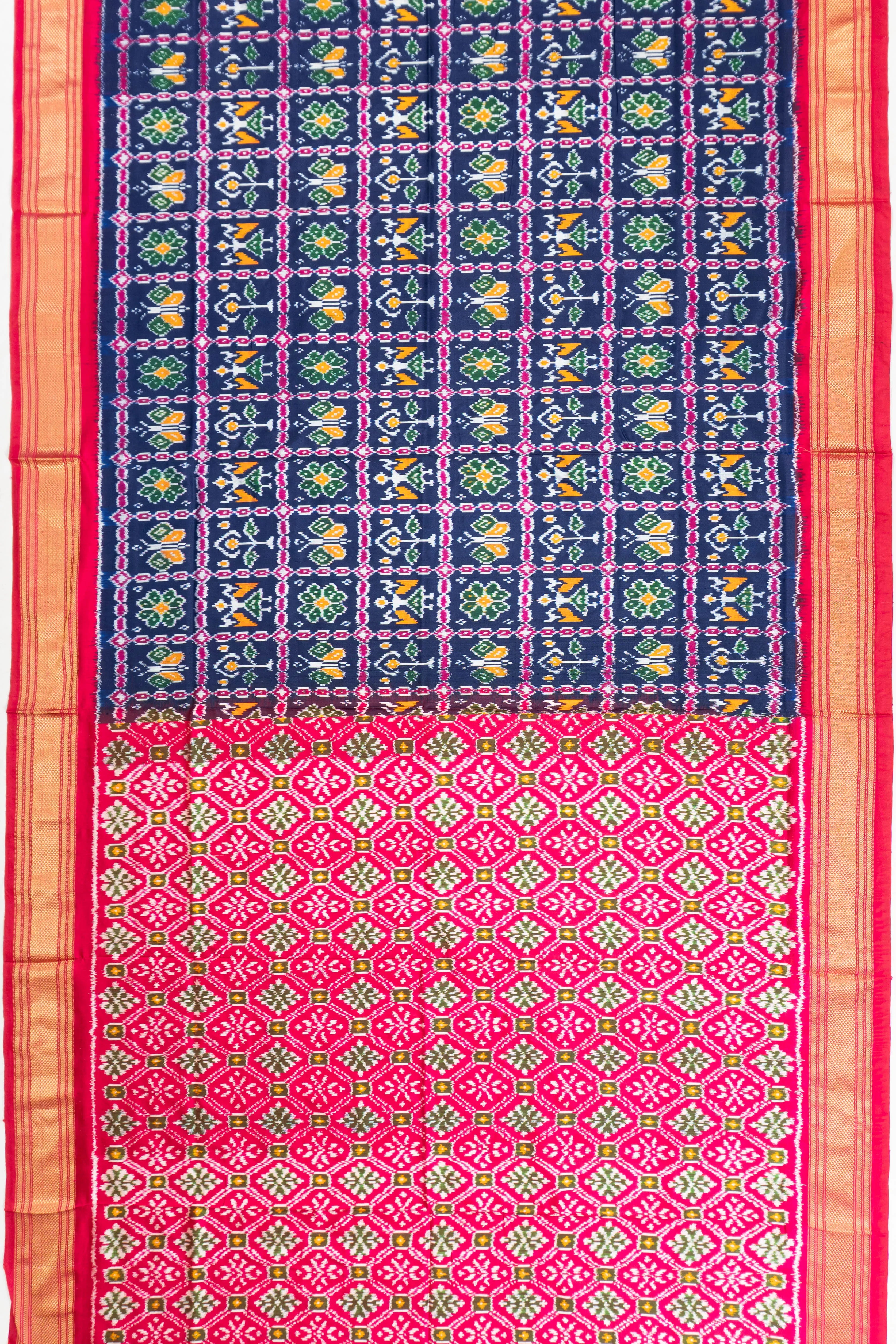 The pallu, with its striking floral ikat design, offers an exquisite visual balance, making it a statement piece for any occasion