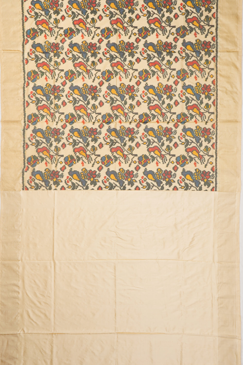 The saree’s body showcases exquisite ikat patterns, an ode to skilled craftsmanship, while the self gold zari border adds a touch of opulence with its subtle yet striking presence