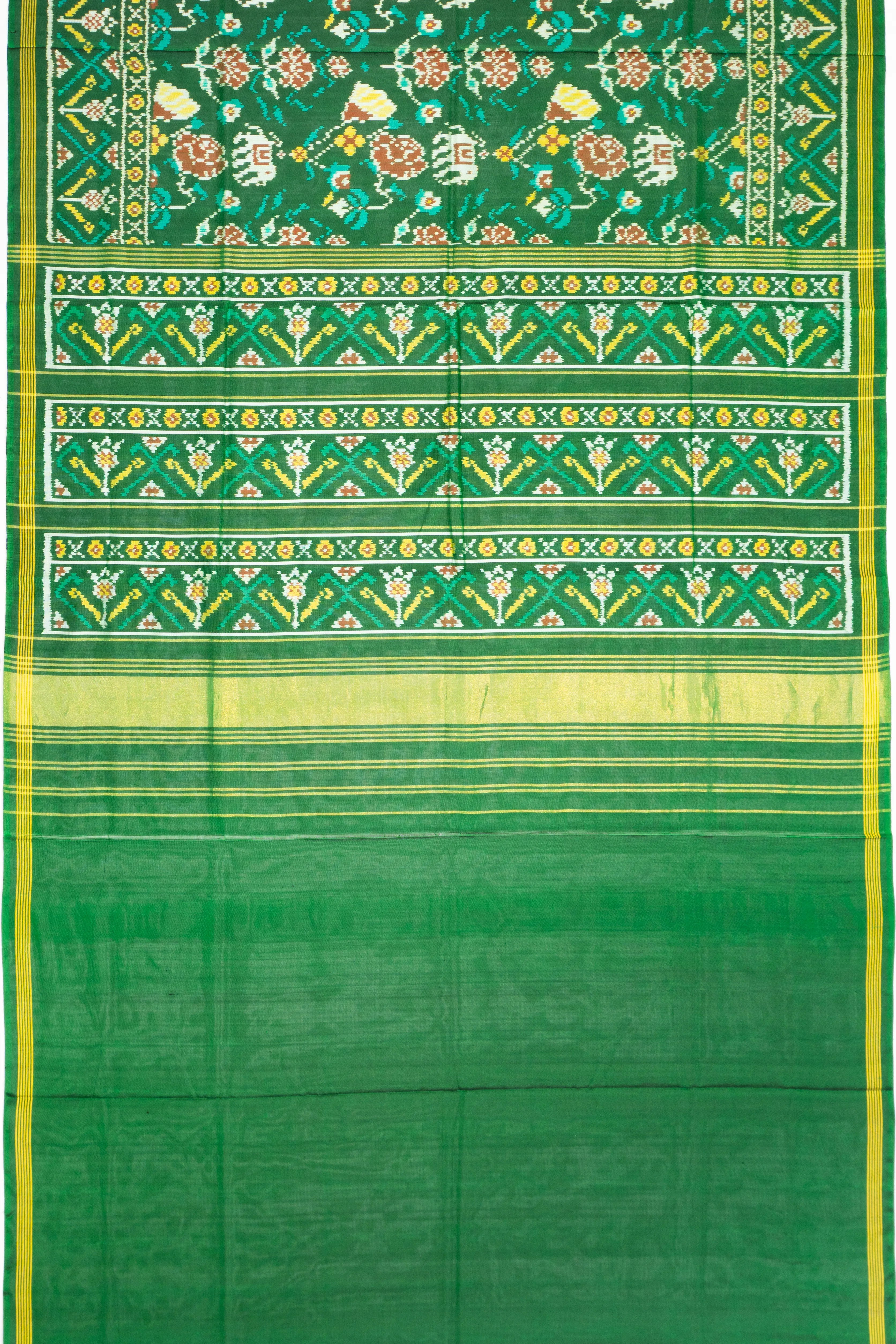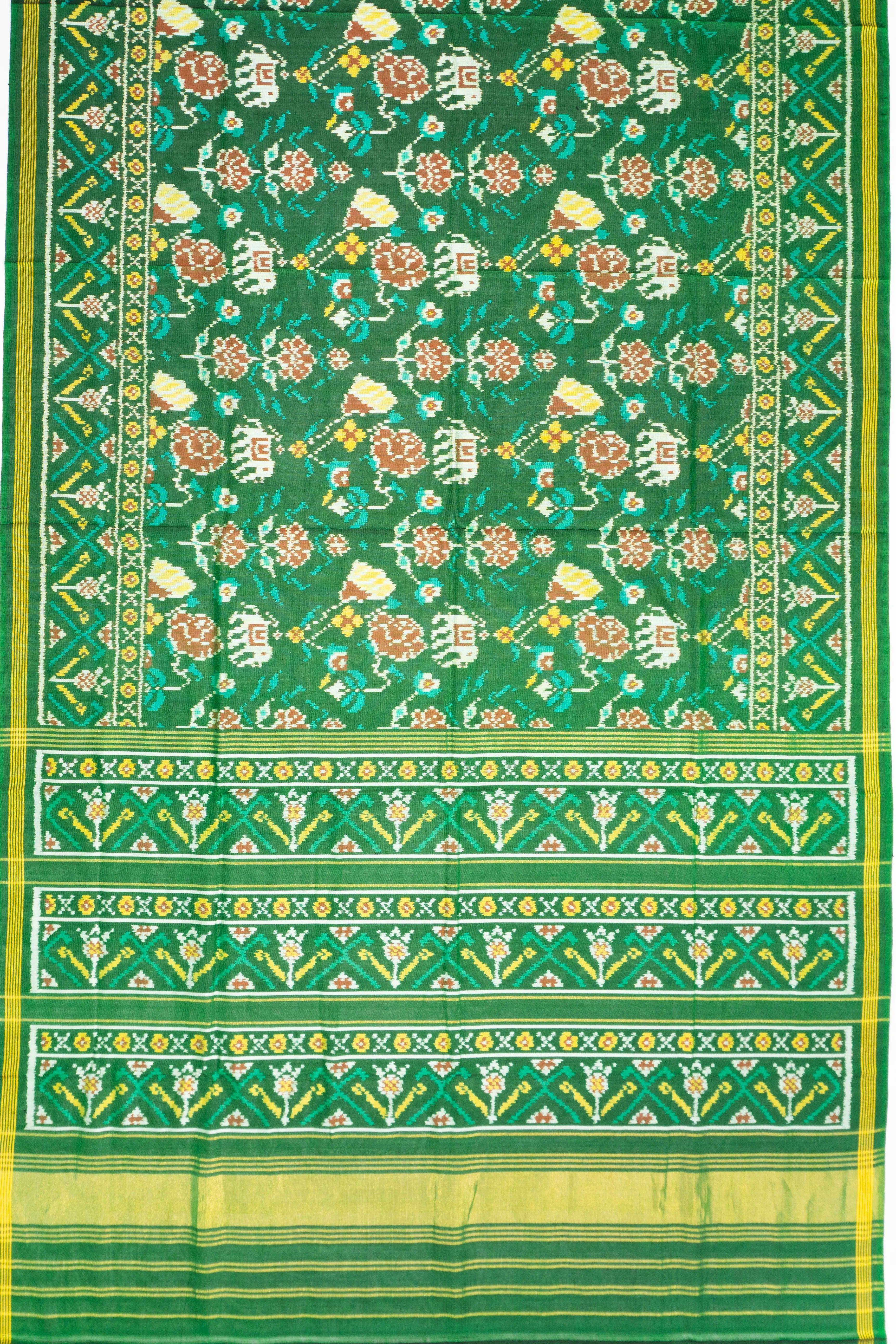 The border, adorned with self floral ikat designs and subtle horizontal lines, offers a harmonious frame to the saree's vibrant body