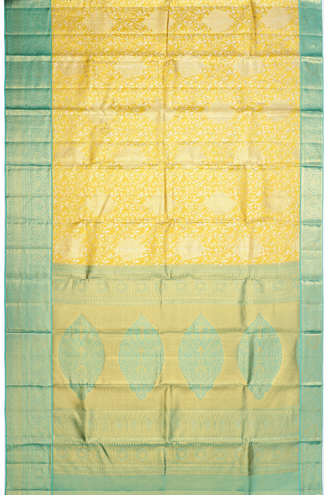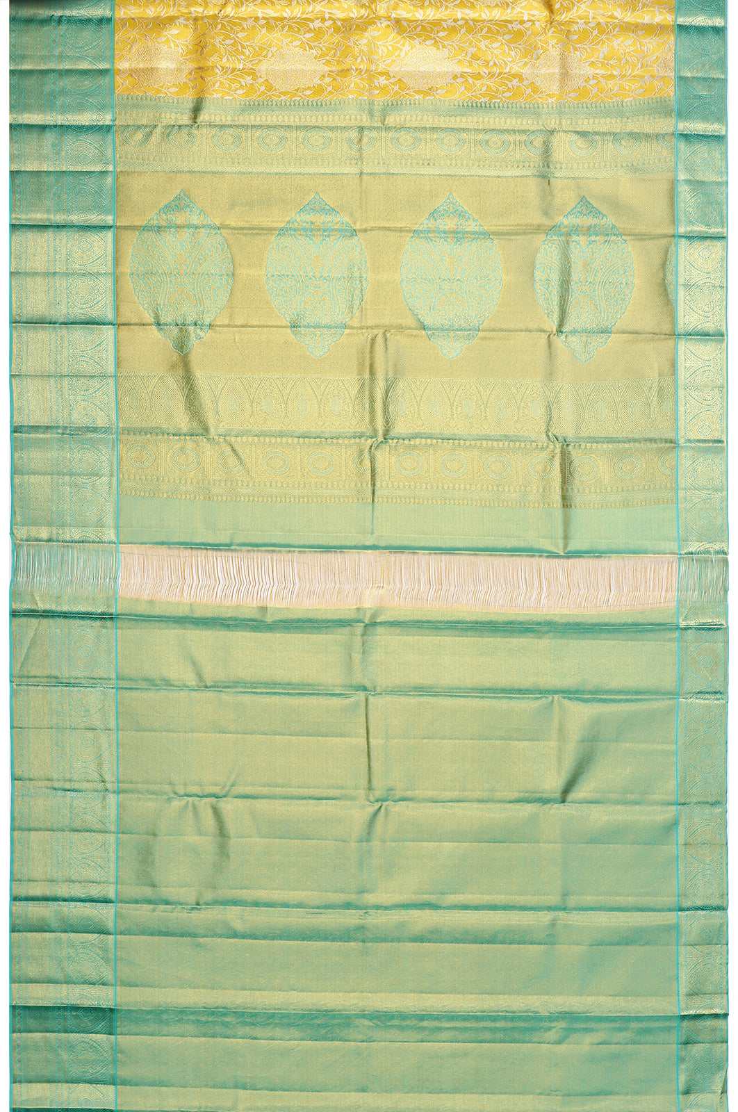 The shimmering gold body, woven with exquisite silk and zari, radiates an aura of timeless sophistication, making it a splendid choice for any grand occasion