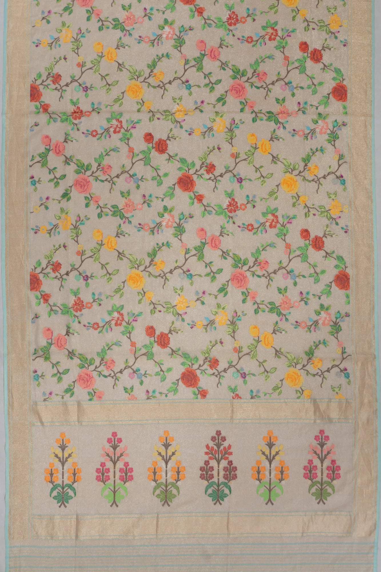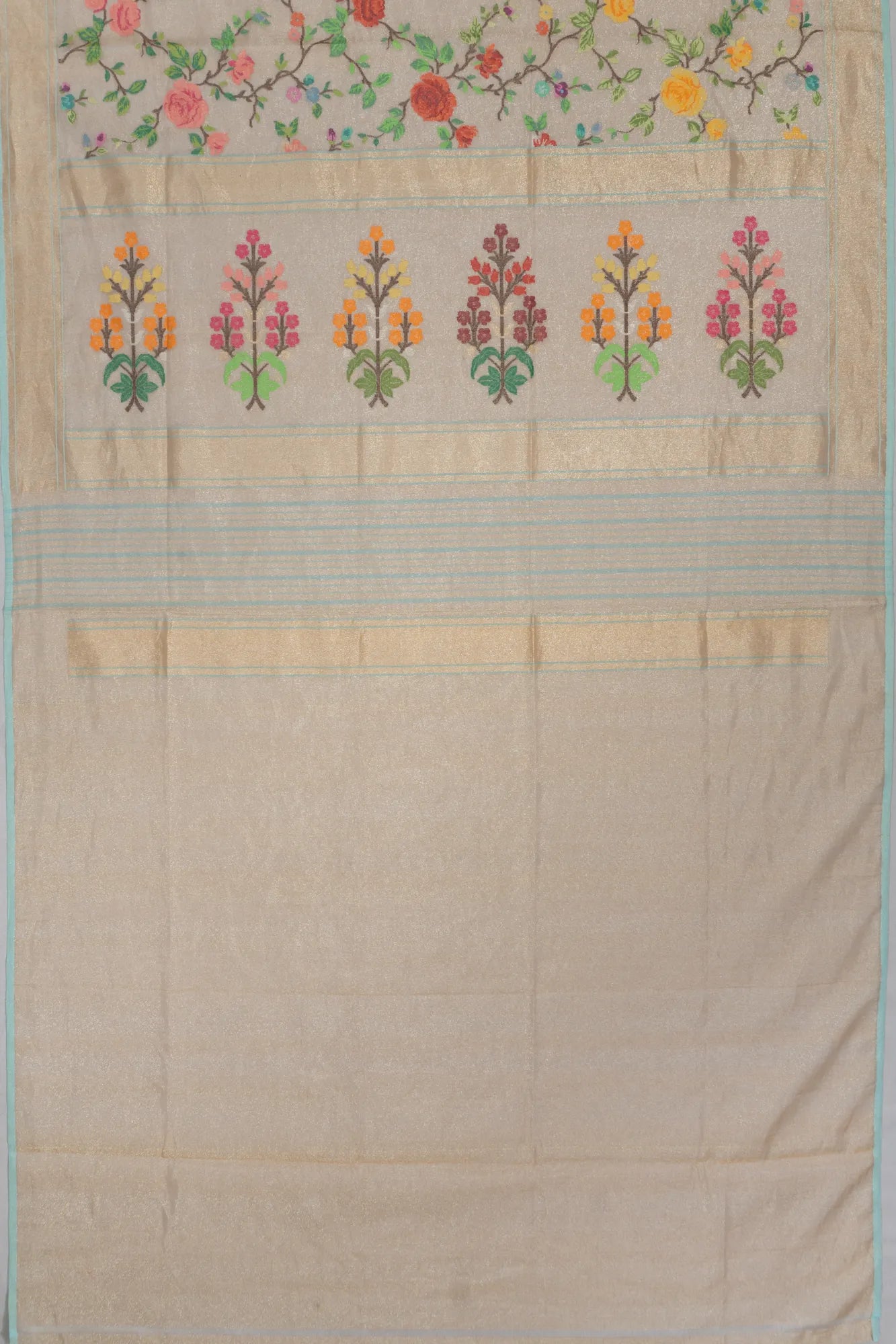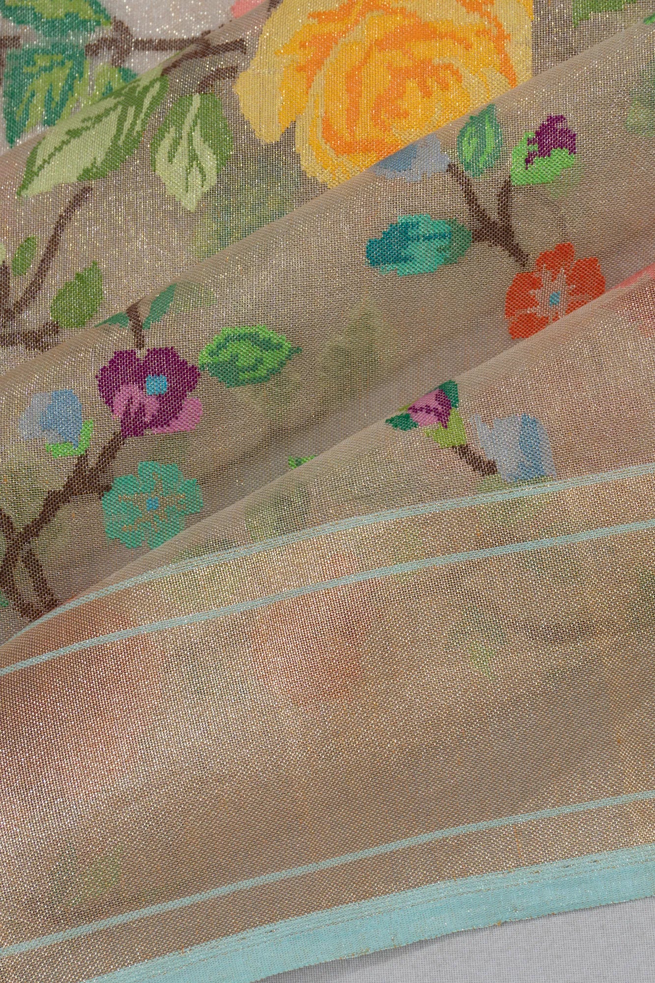 The saree's border features a big gold zari tissue with a sky-blue edge, adding a touch of elegance that frames the entire piece beautifully