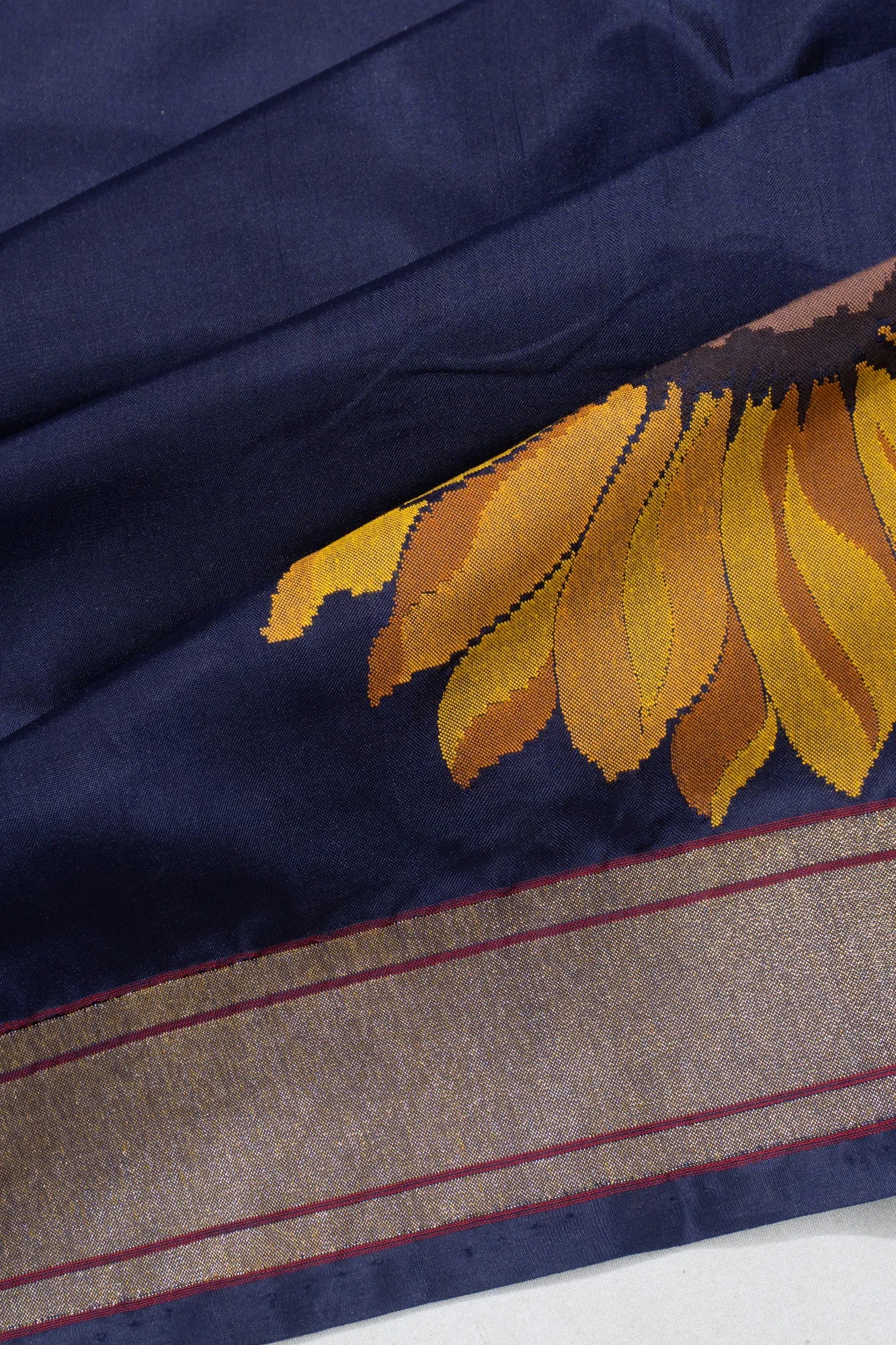 The coordinated blue pallu, with its gold zari kaddi detailing, completes this masterpiece, offering a seamless blend of tradition and style