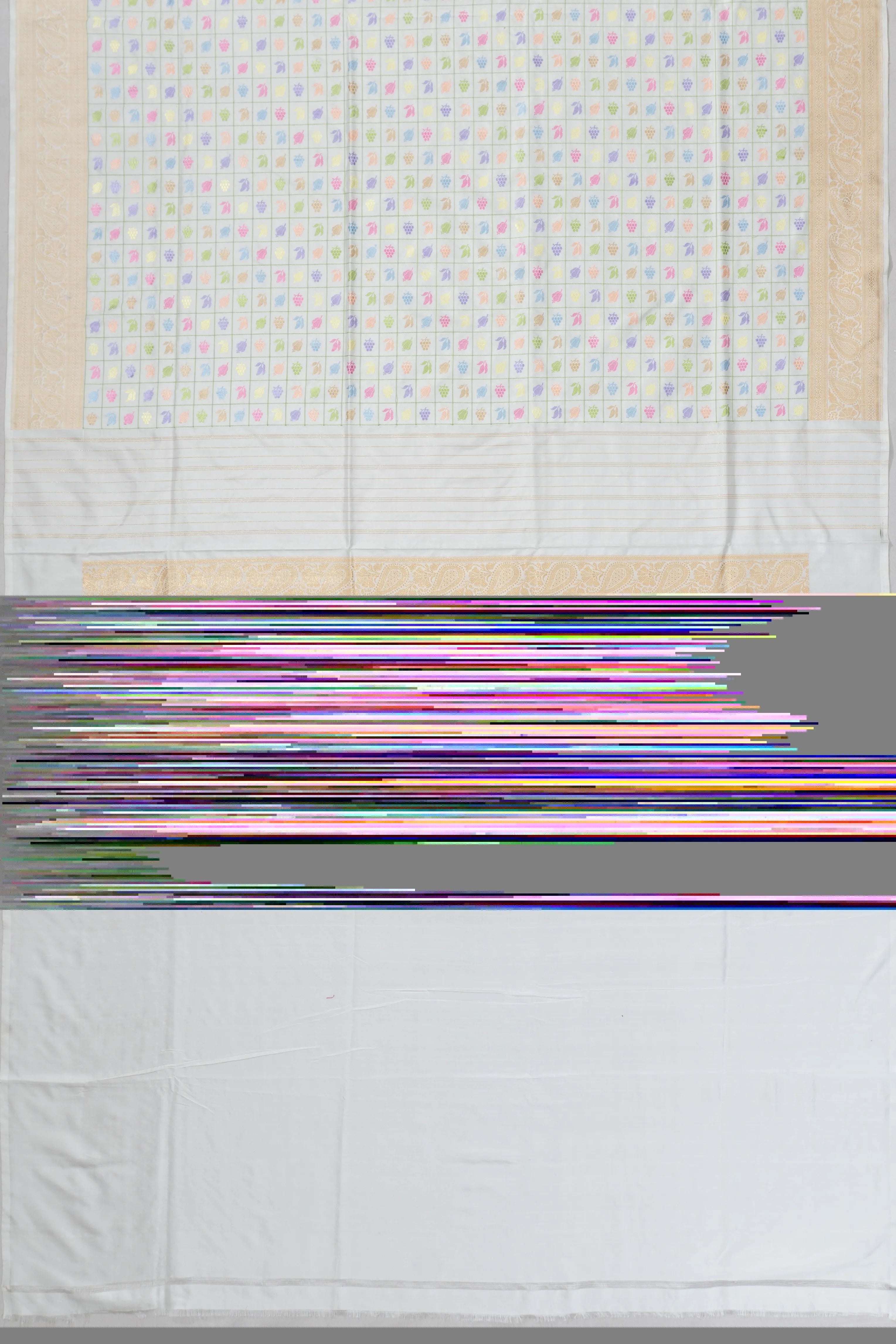 This saree features a grand border, intricately woven with gold zari paisley buttas and floral vine brocade, adding depth and richness to its harmonious design