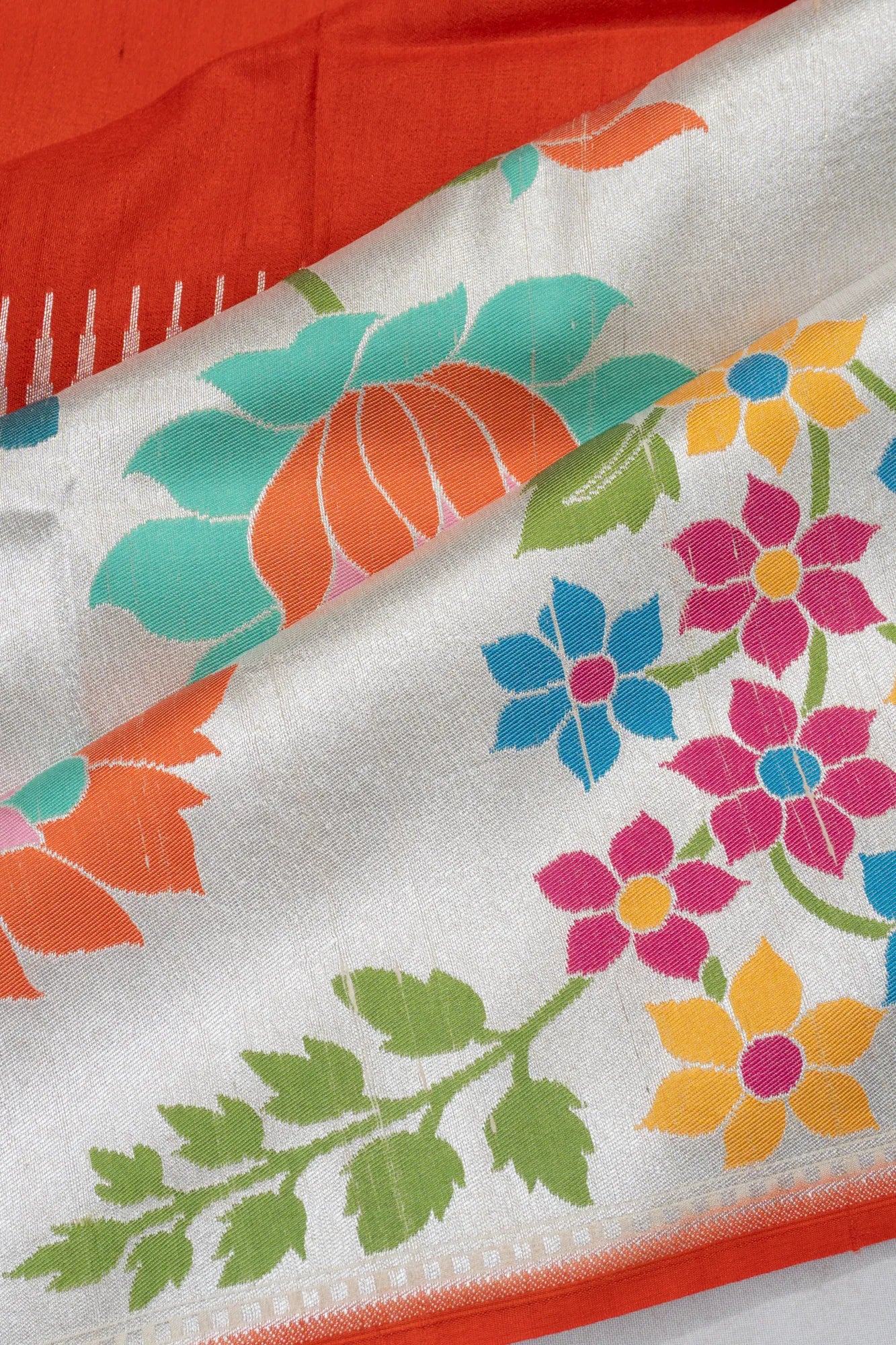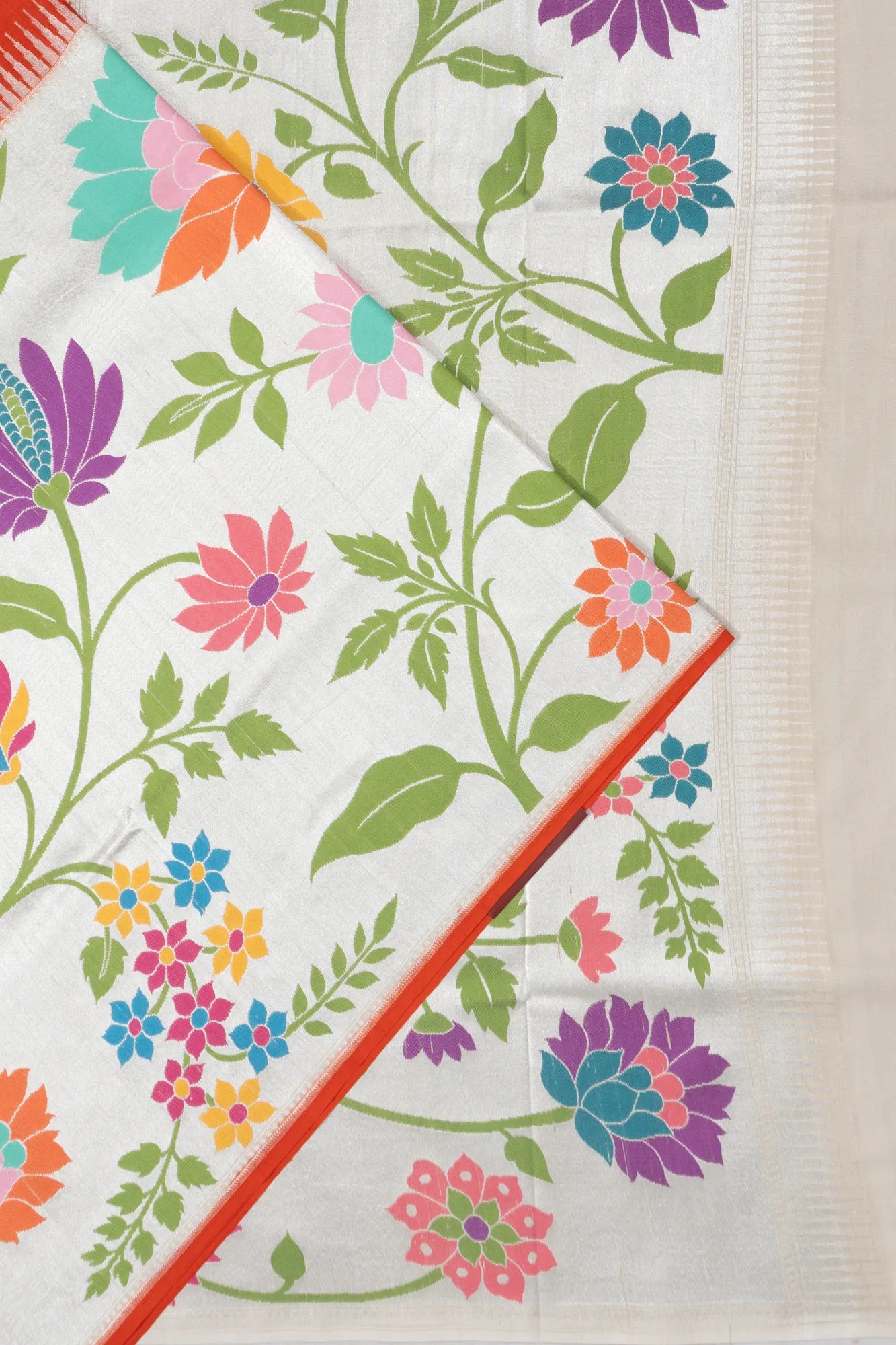 The saree features a self-designed border in a rich half-and-half orange zari, offering a harmonious transition to the pallu, which mirrors the floral vine brocade design