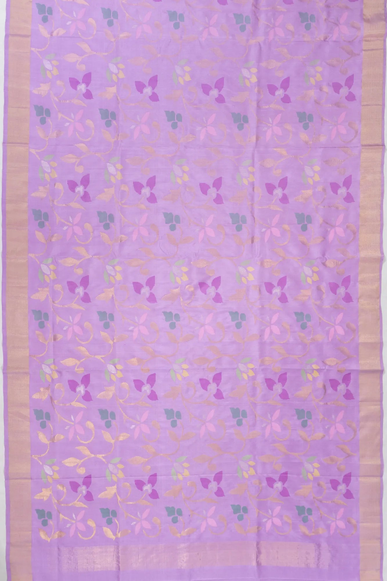 The body gracefully showcases a gold zari floral jaal, intricately woven with the finesse of jamdani craftsmanship, offering a touch of luxury with every drape