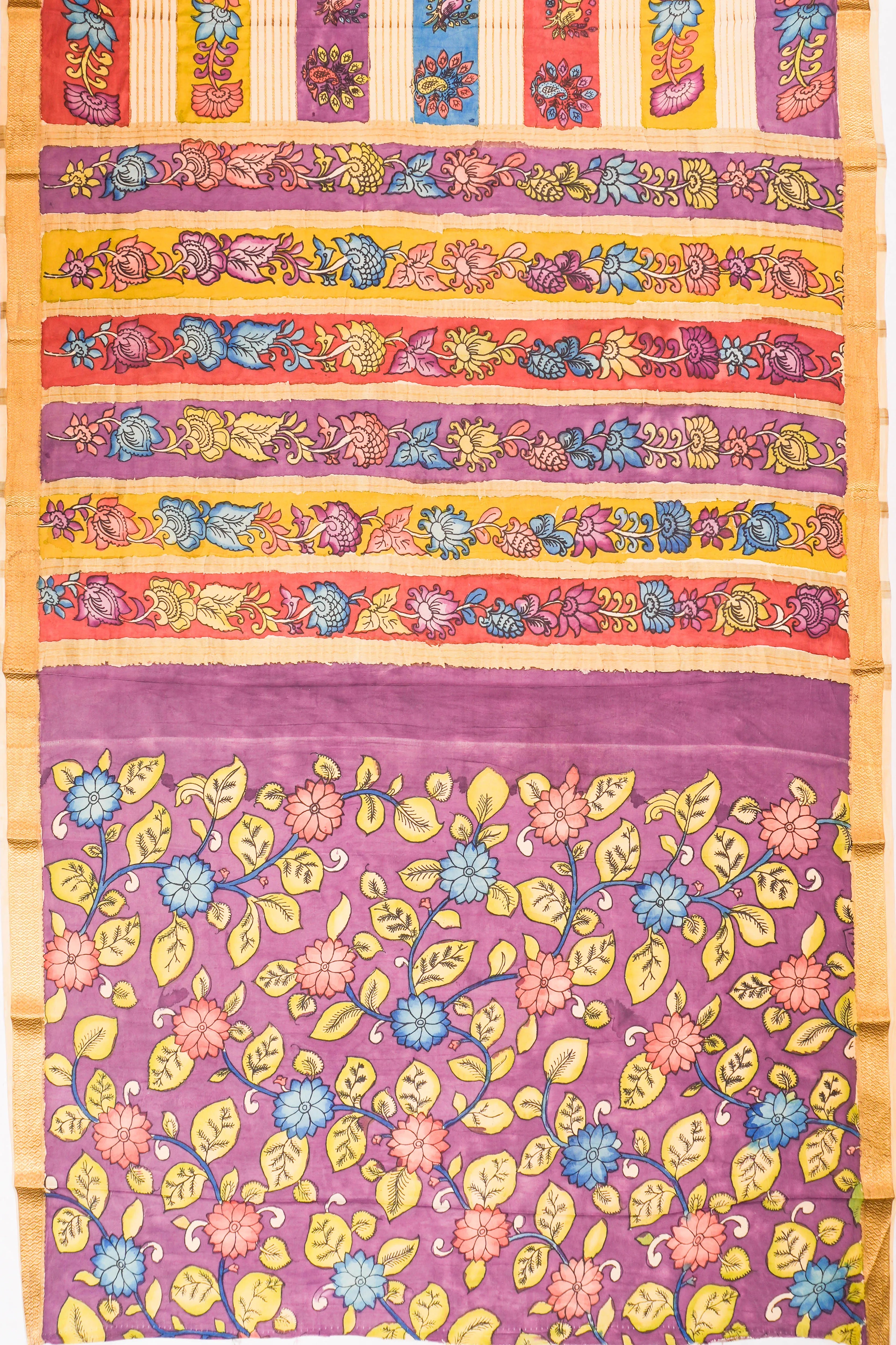 The saree's body is a canvas of handpainted floral vine motifs in shades of purple, blue, yellow, and red, intertwined with elegant gold zari lines that add a touch of opulence