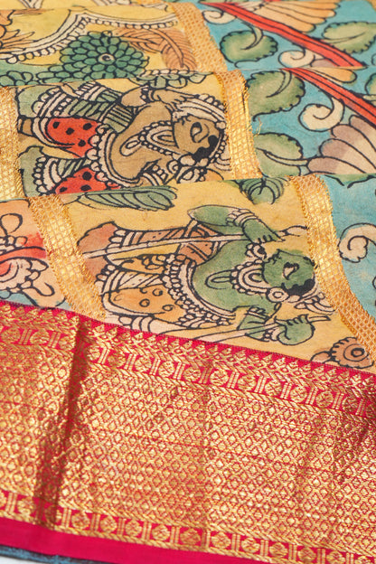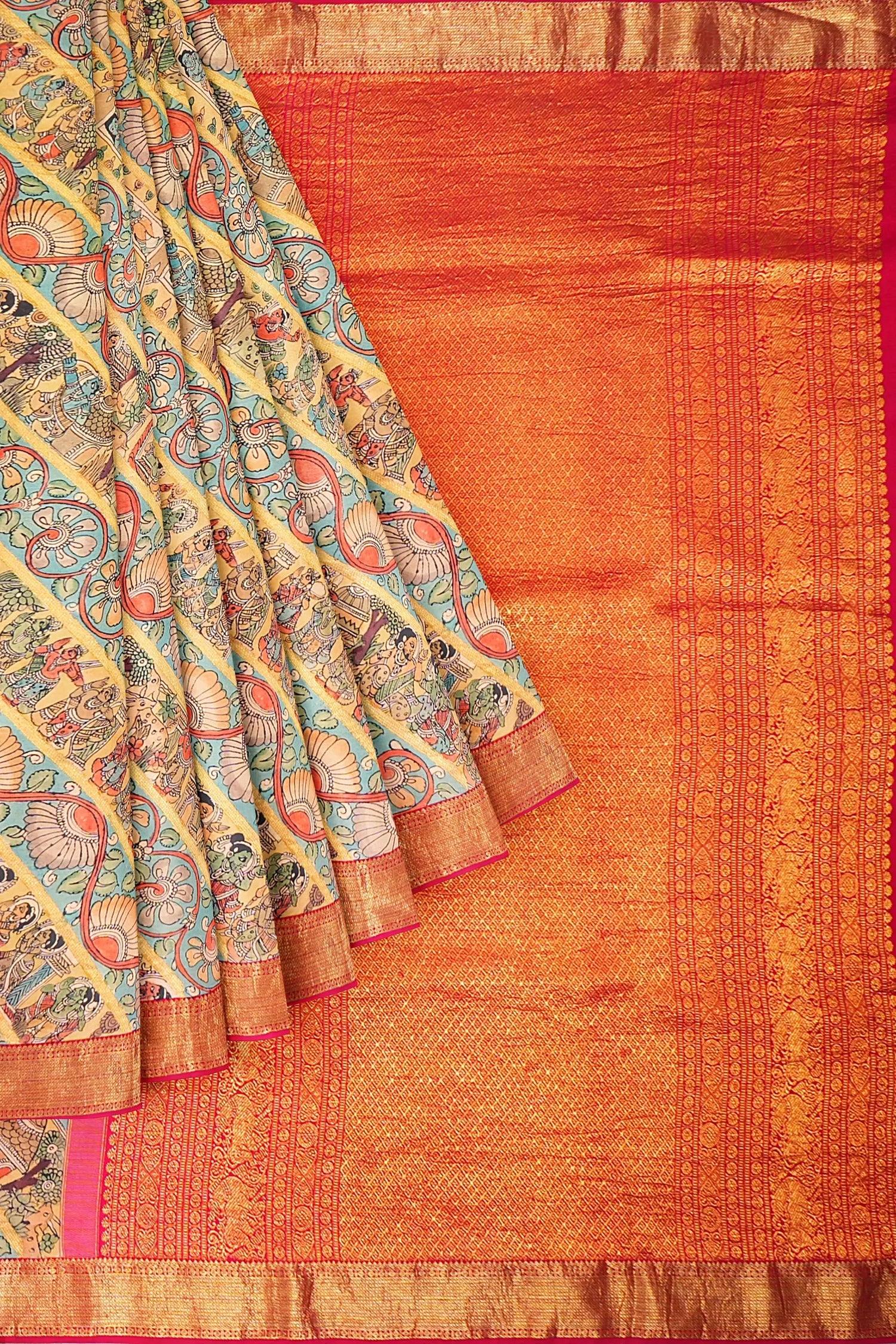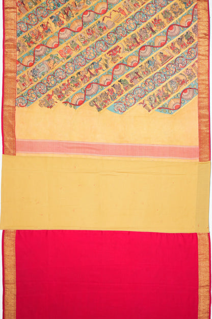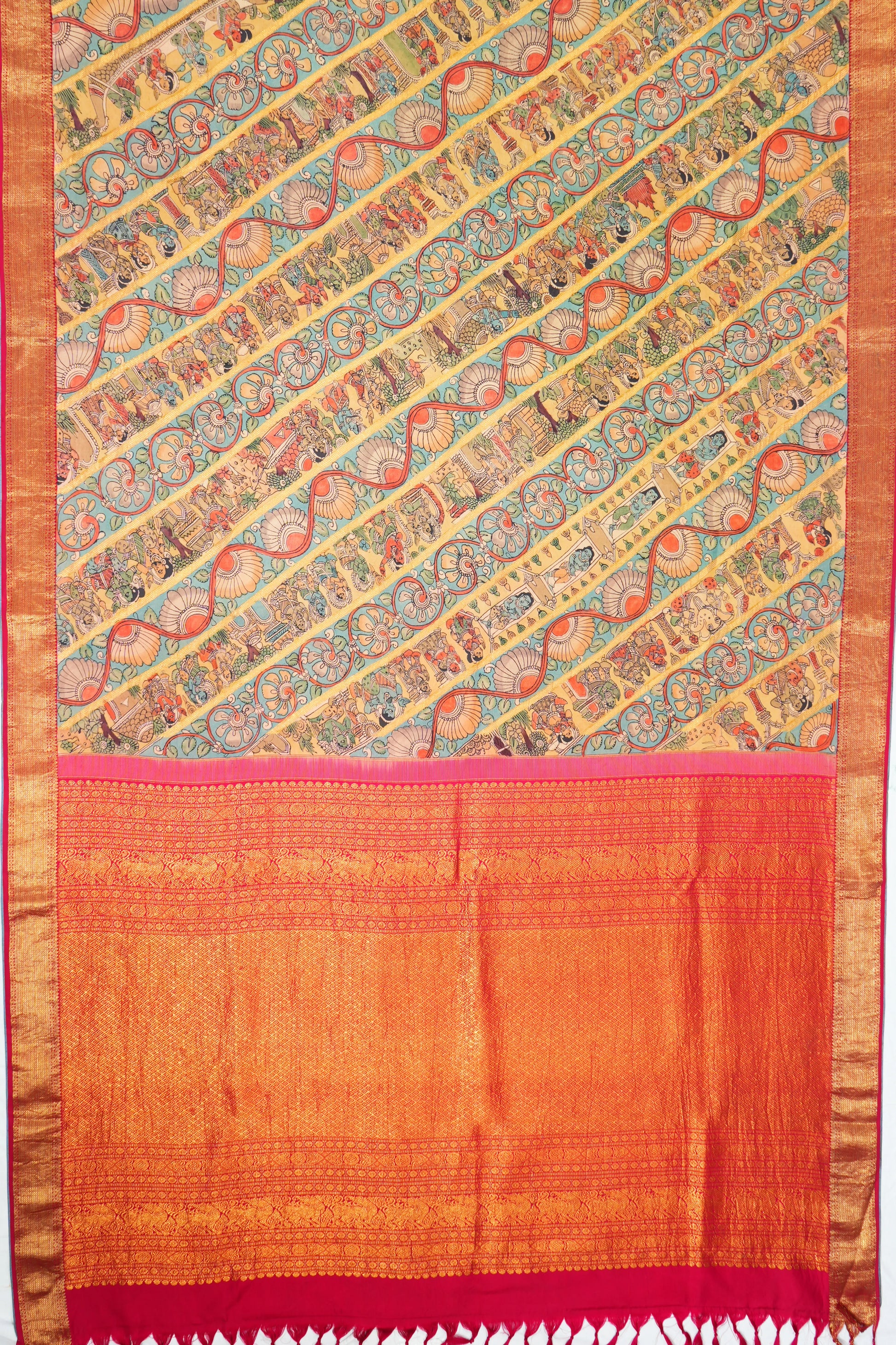 Kanchipuram Silk Kalamkari Hand Painted Yellow Saree