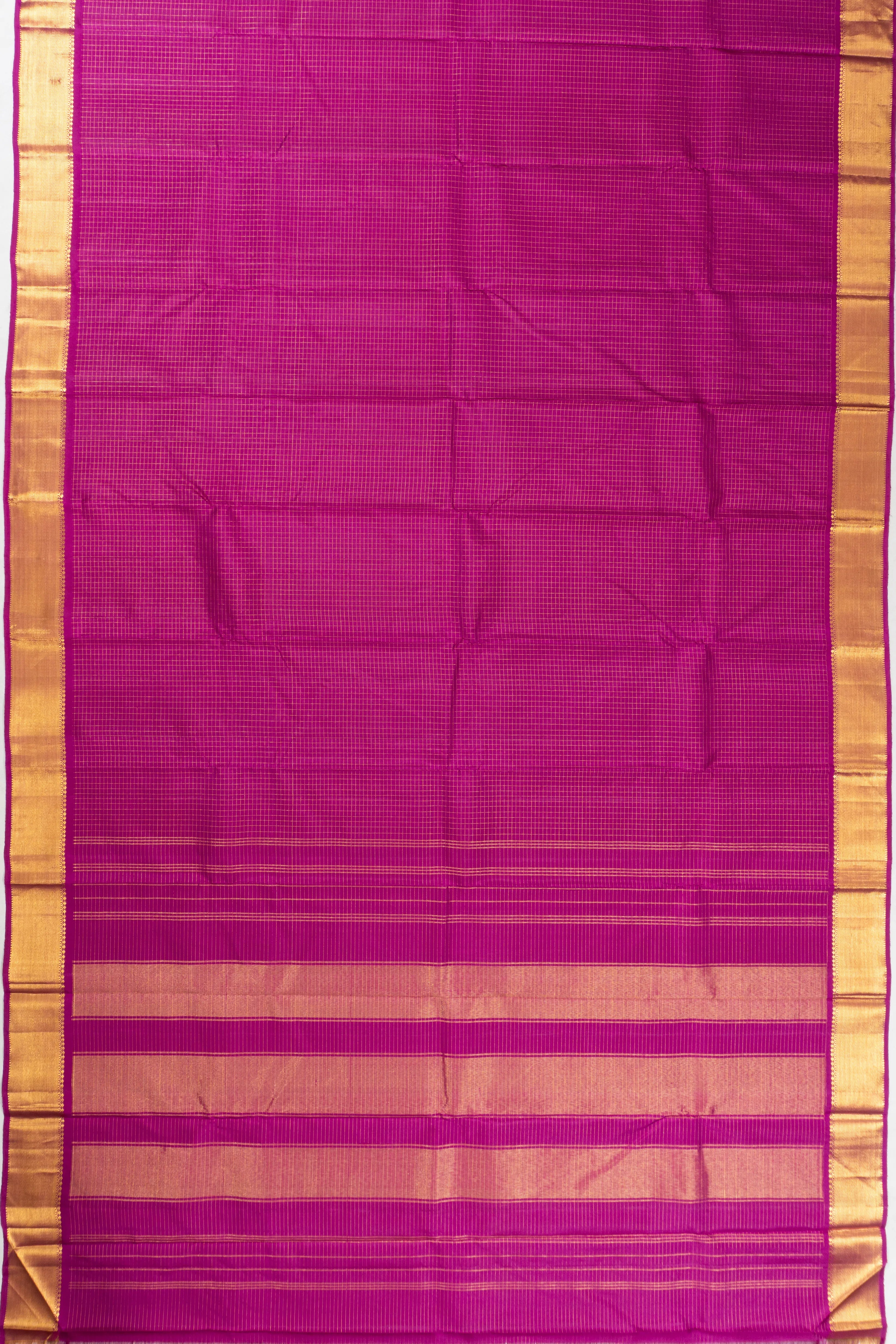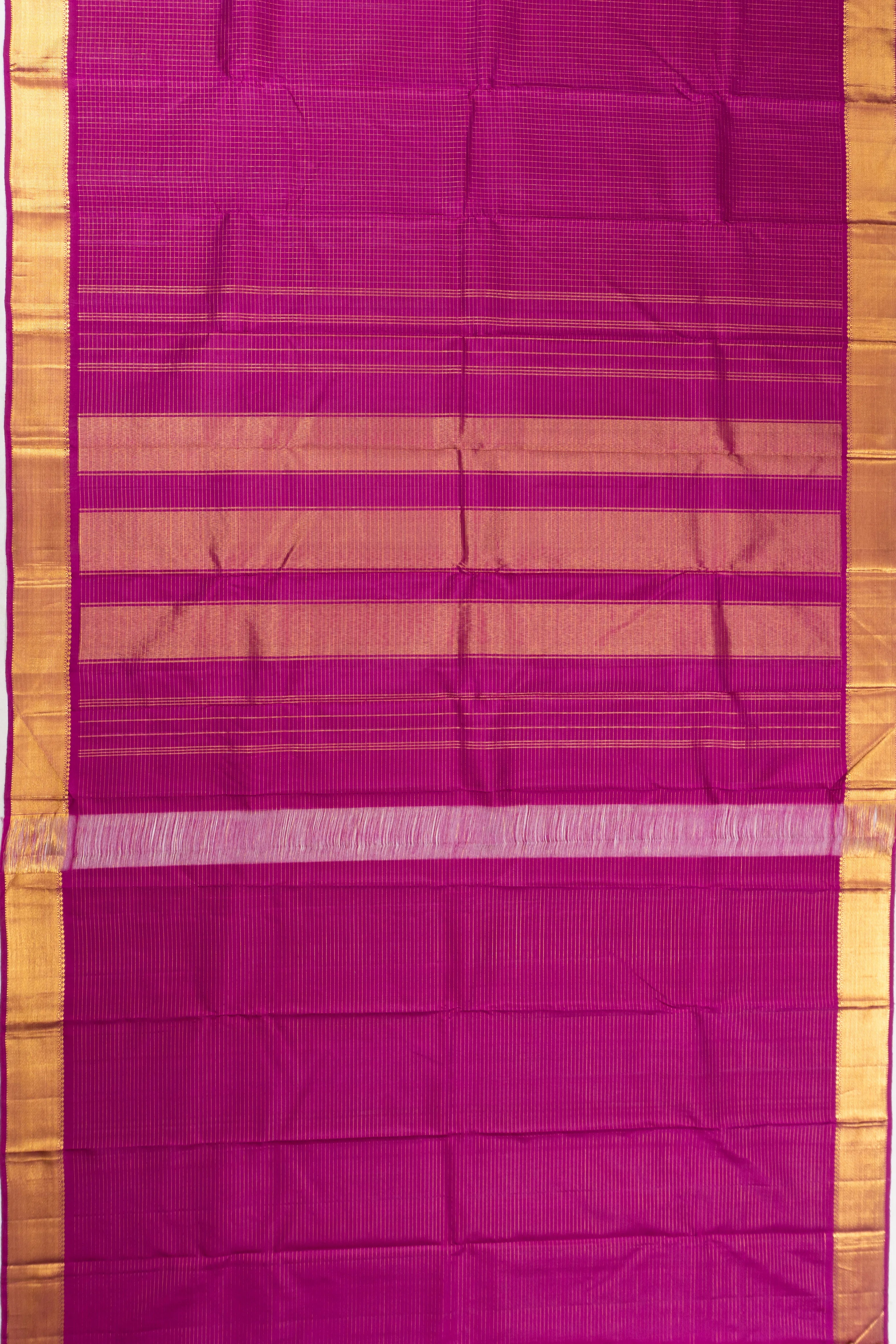 The body is beautifully adorned with gold zari checks, exuding a subtle shimmer that enhances the saree's graceful appeal
