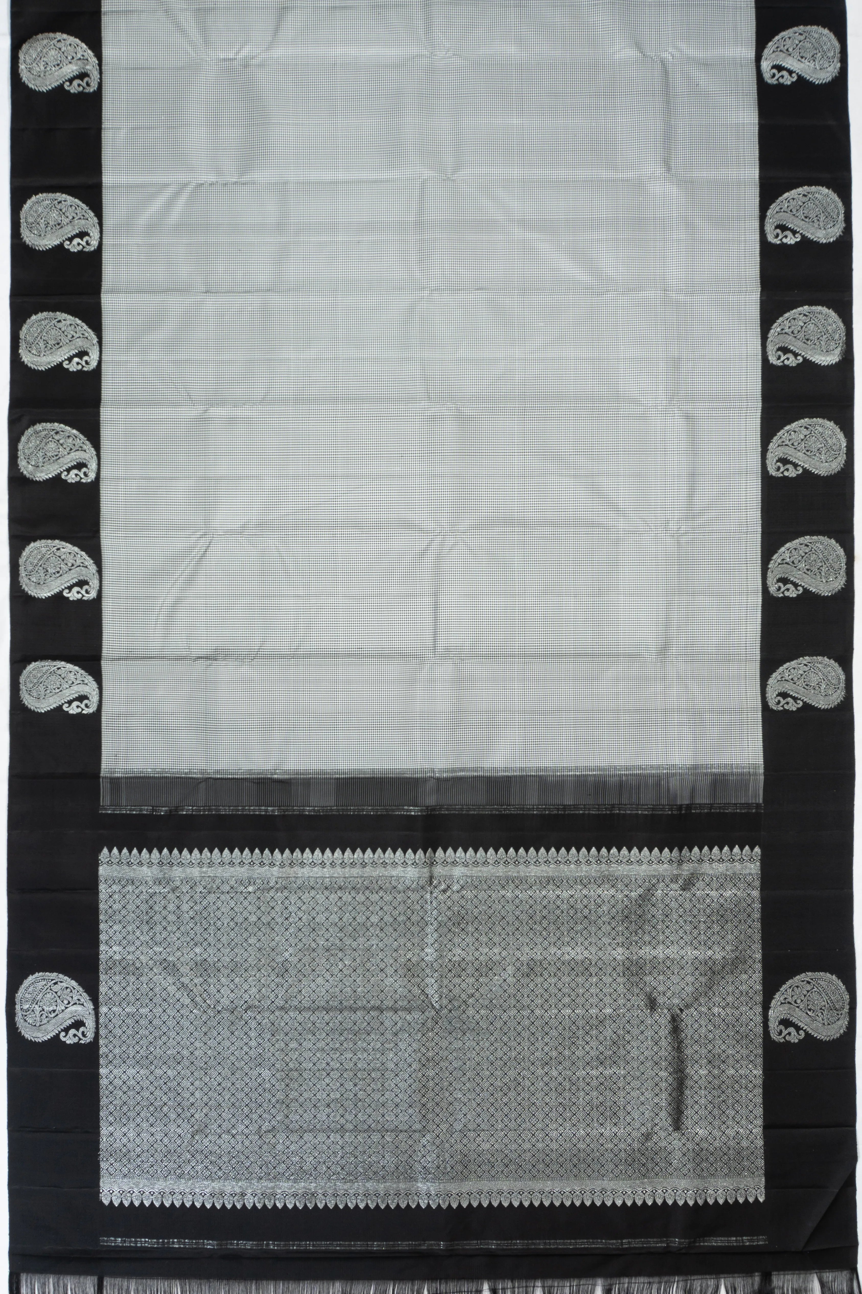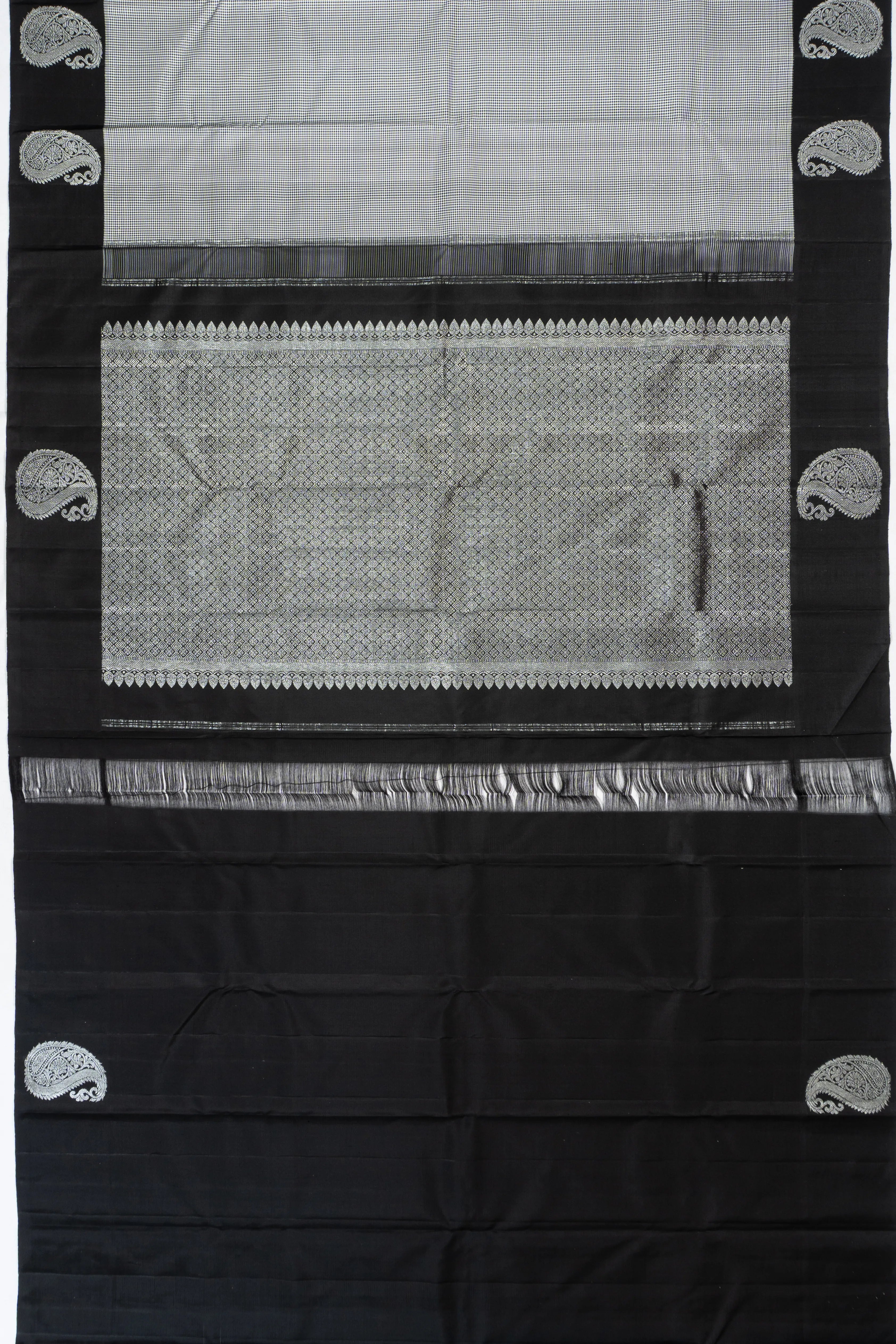 Embrace the heritage-rich charm of this Kanchipuram Silk Checks Saree in a striking white and black palette The body features classic checks that lend a timeless sophistication, enhanced by a contrasting small border of silver zari floral paisley butta in black, highlighting the saree's elegance