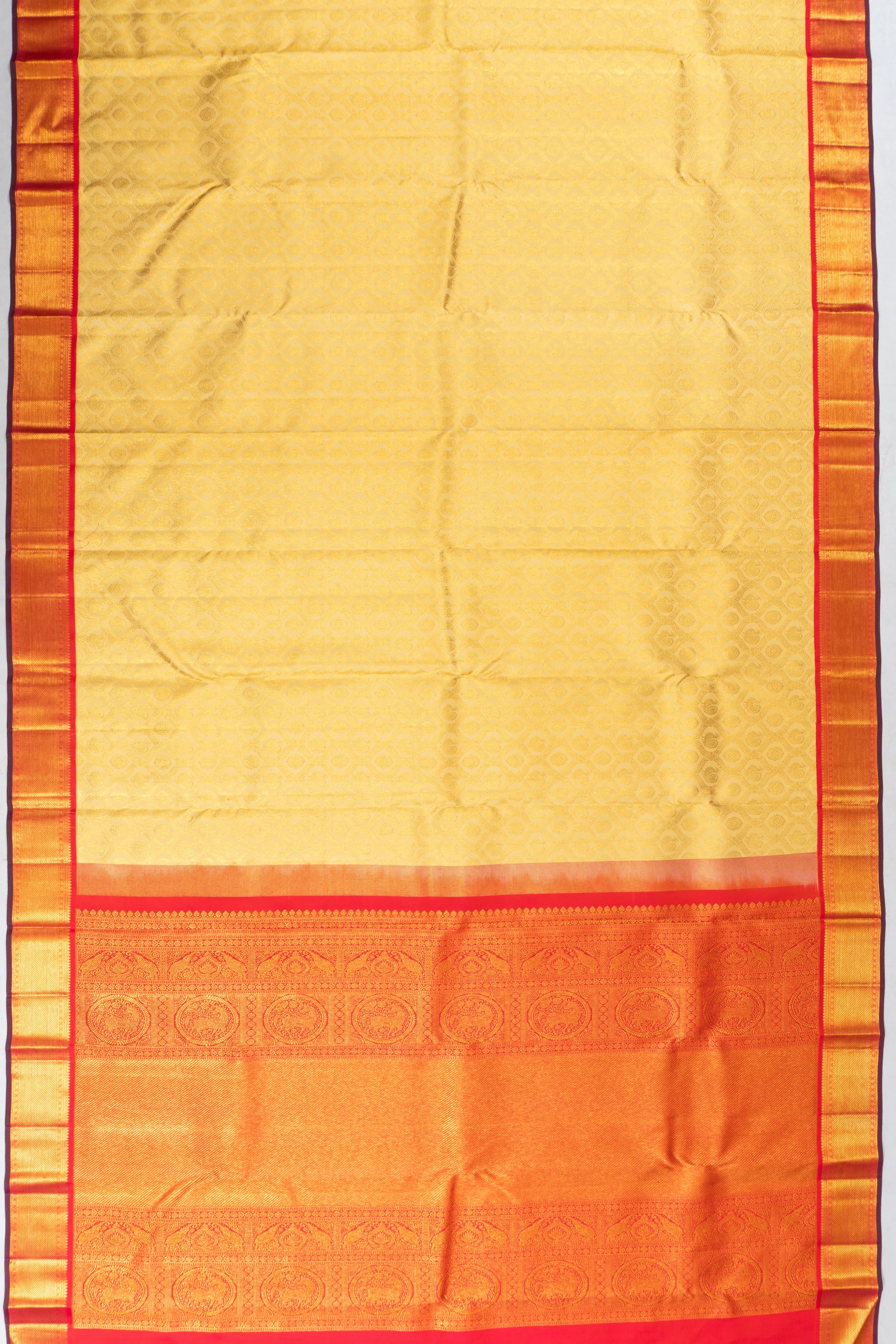 The body is adorned with gold zari floral brocade, beautifully interspersed with peacock motifs and florals, creating a tapestry of grace and refinement