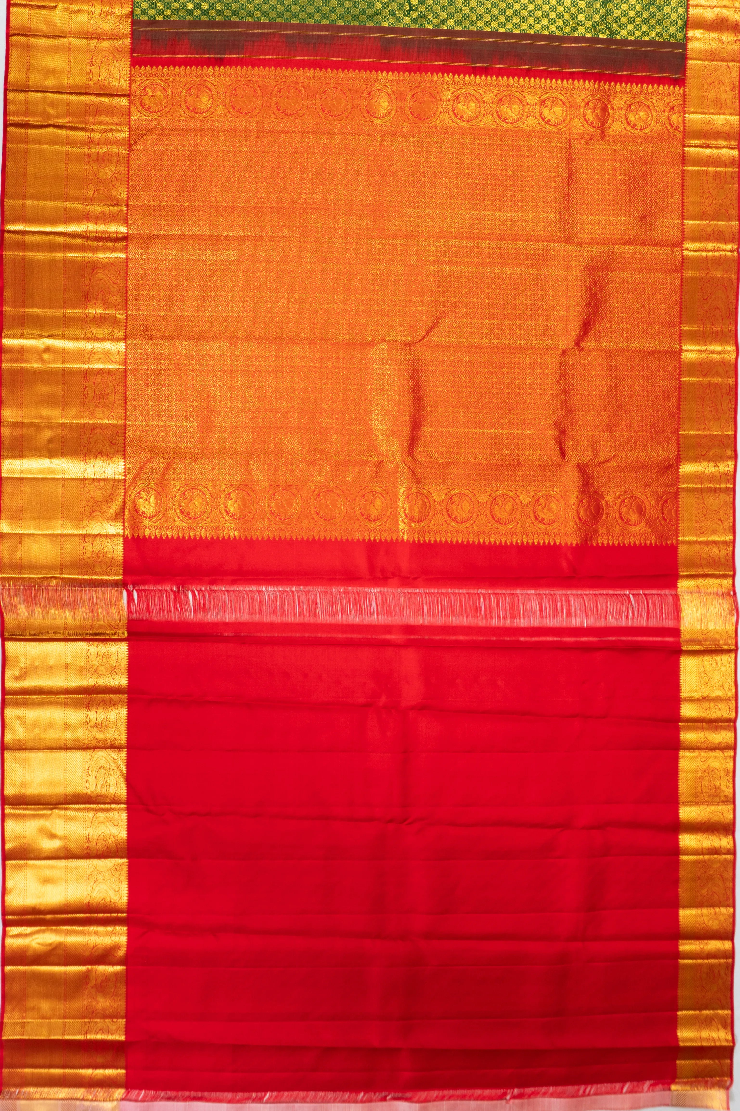 The contrasting red border, enriched with gold zari brocade, is accentuated by enchanting peacock motifs nestled in floral vines, offering a striking visual contrast