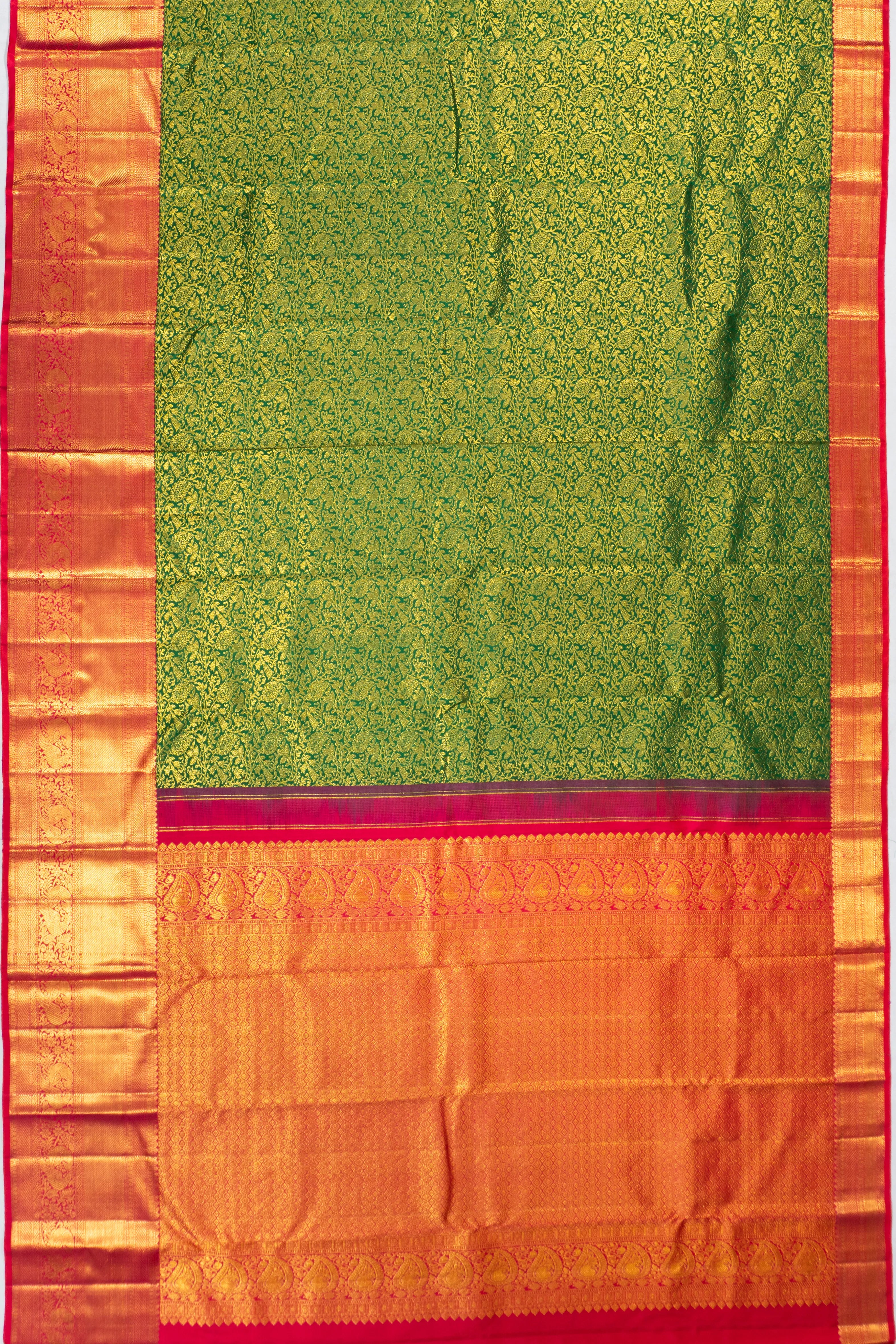 A contrast red border enhances the saree’s elegance, featuring gold zari diagonal lines and exquisite peacock motifs nestled in floral vines