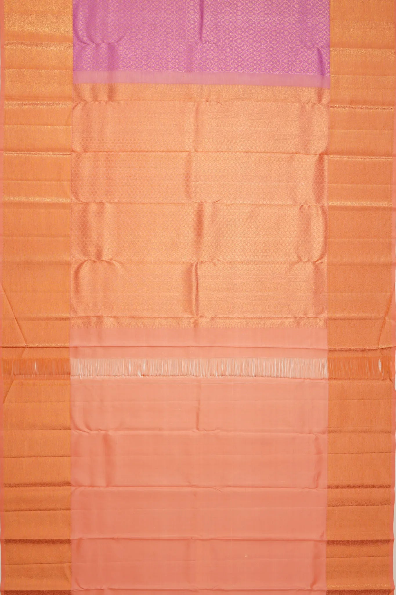 Accompanied by a complementary peach blouse with zari borders, this saree encapsulates grace and sophistication