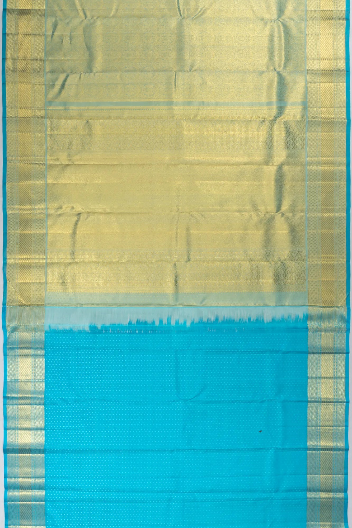The saree features a self-border with intricate gold zari brocade, highlighted by a contrast blue selvedge, creating a harmonious blend of colors and textures
