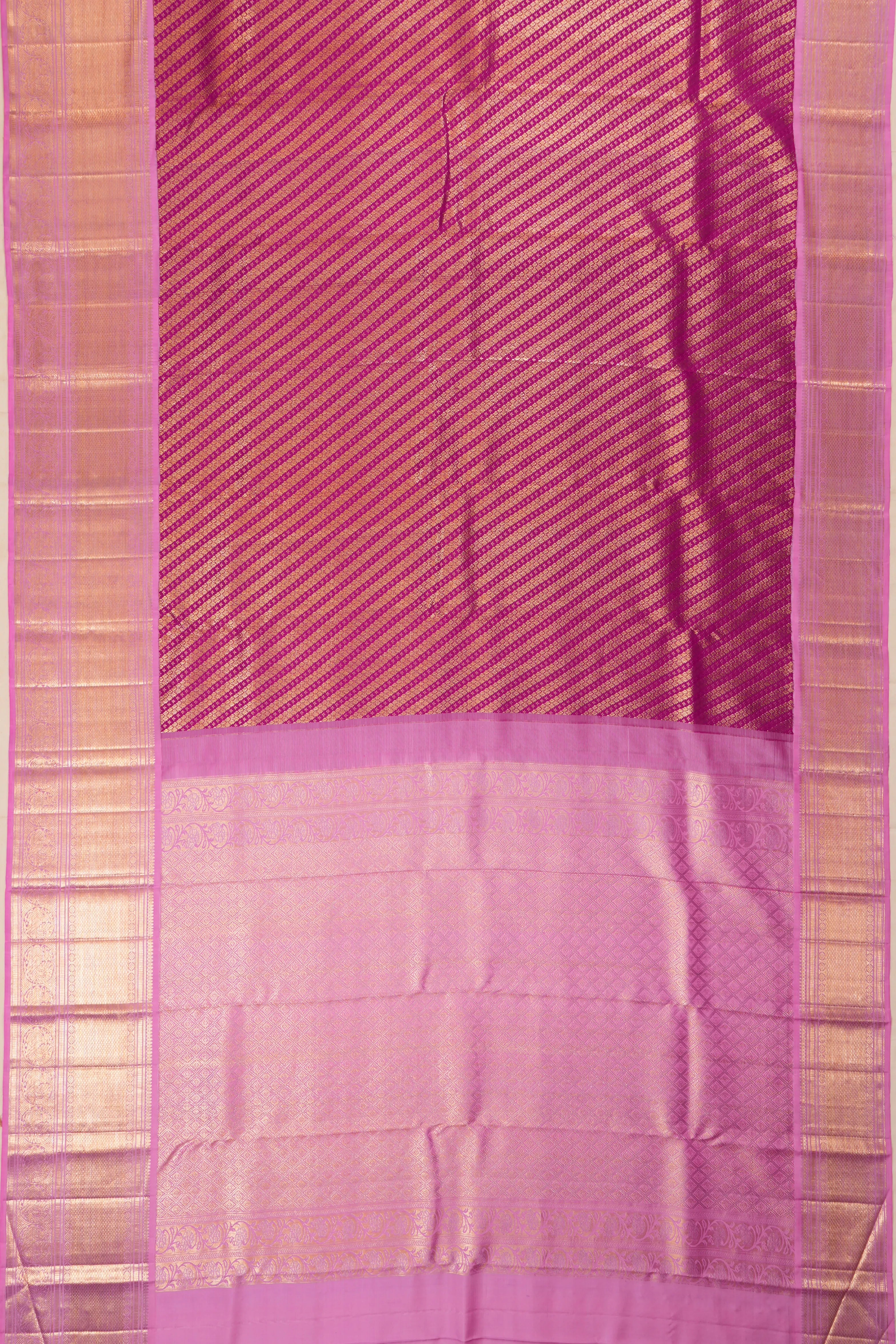 Framed in a contrast pink medium border embellished with gold zari brocade featuring peacock motifs in florals, adding a regal and graceful accent.