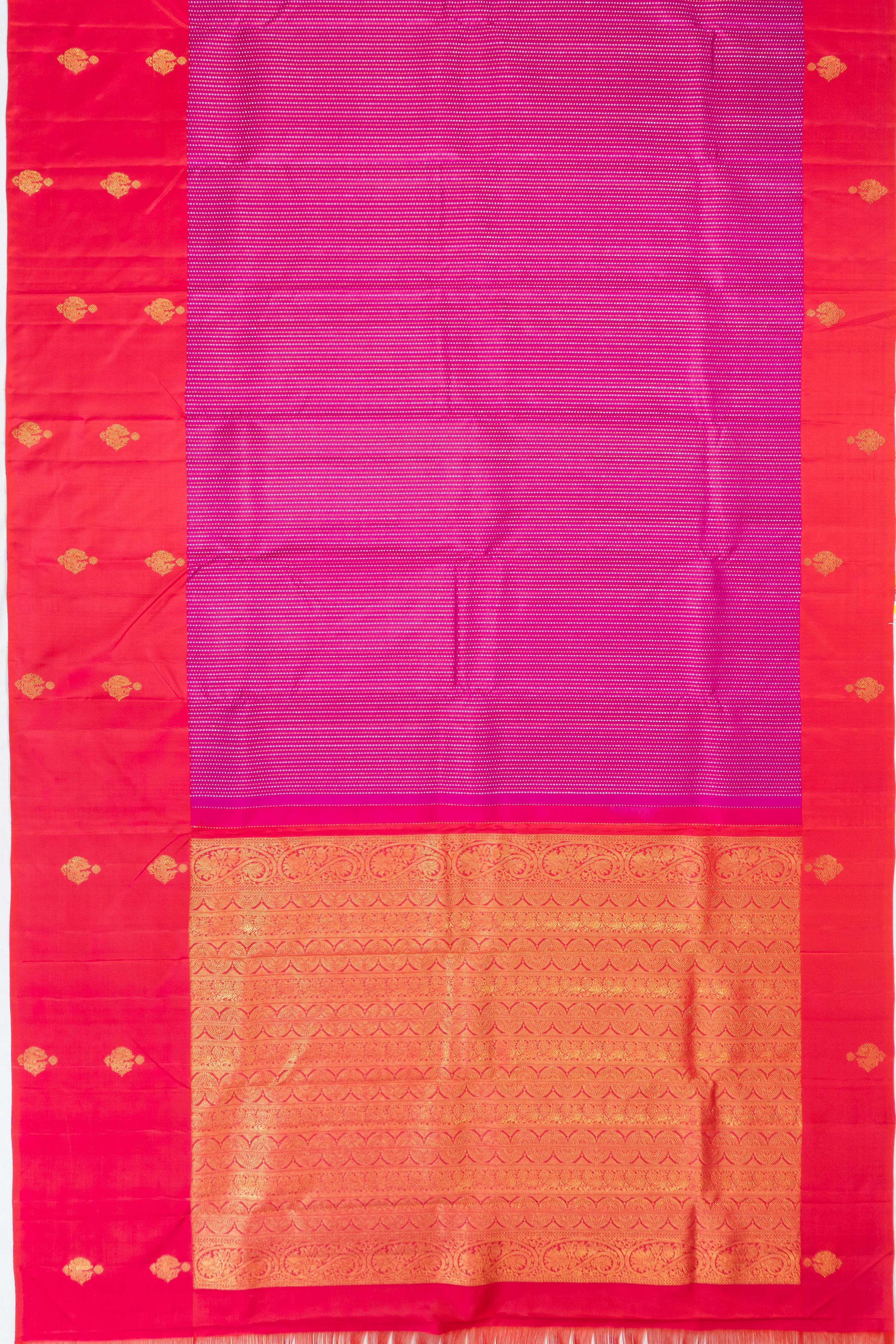 Wrap yourself in the regal allure of the Kanchipuram Silk Brocade Rani Pink Saree, a masterpiece of traditional artistry The saree's body is adorned with a gold and silver zari floral brocade that exudes sophisticated charm, making it a perfect choice for those who cherish heritage-rich elegance