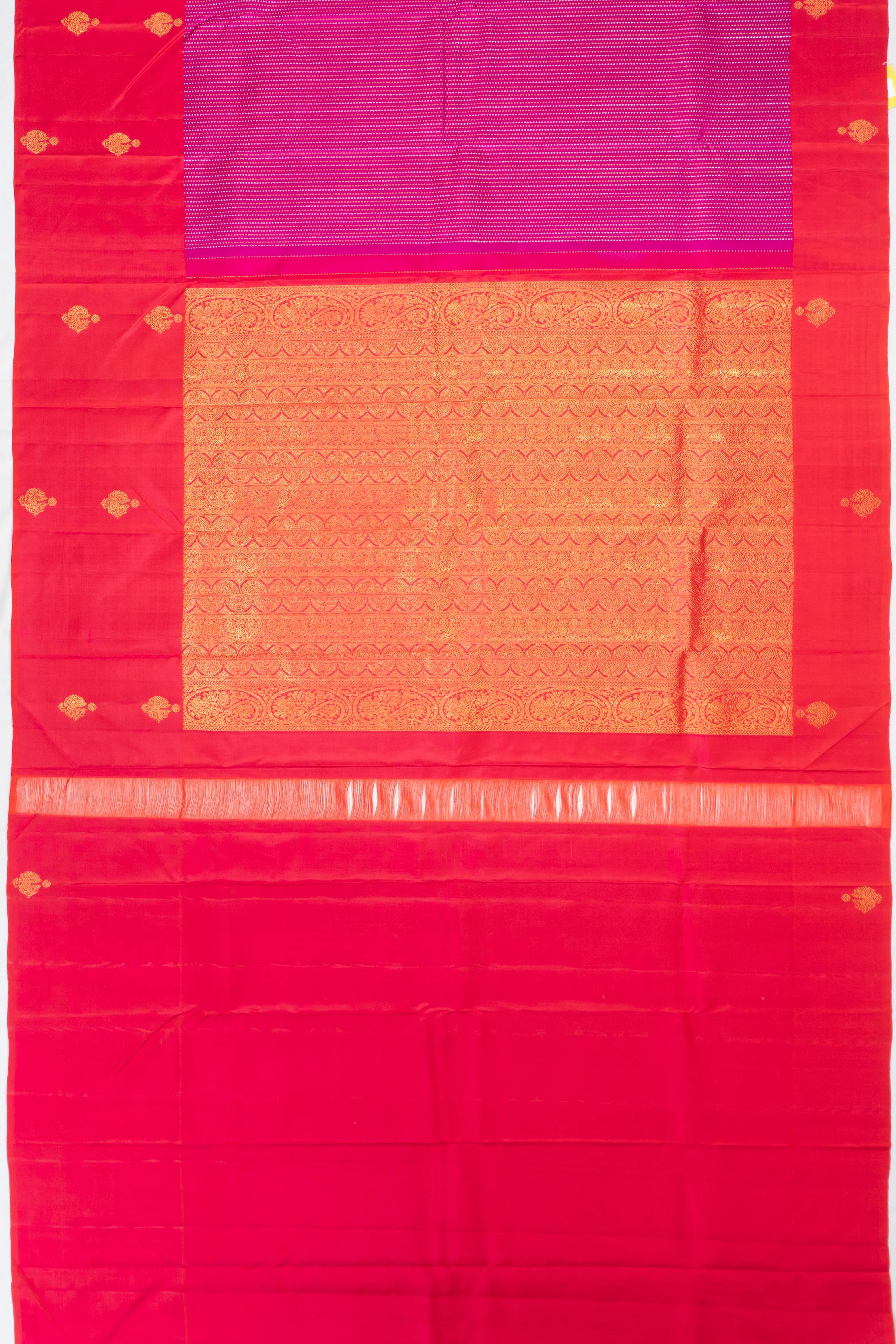 Accompanied by a coordinated red medium border, enriched with gold zari floral buttas, this saree offers a harmonious blend of color and design