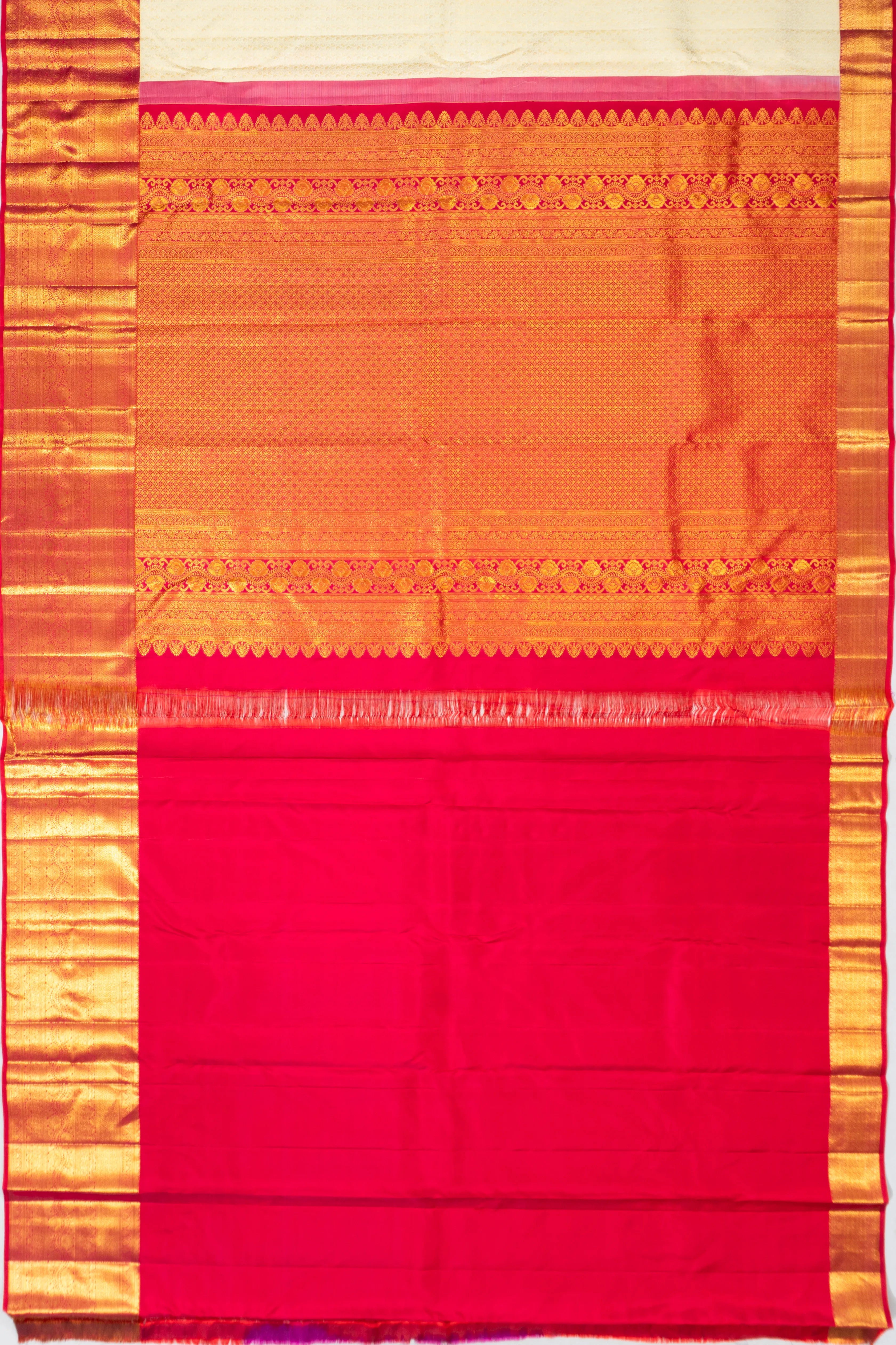 A coordinated red border adorned with intricate gold zari floral brocade adds a striking contrast, enhancing the saree's regal appeal