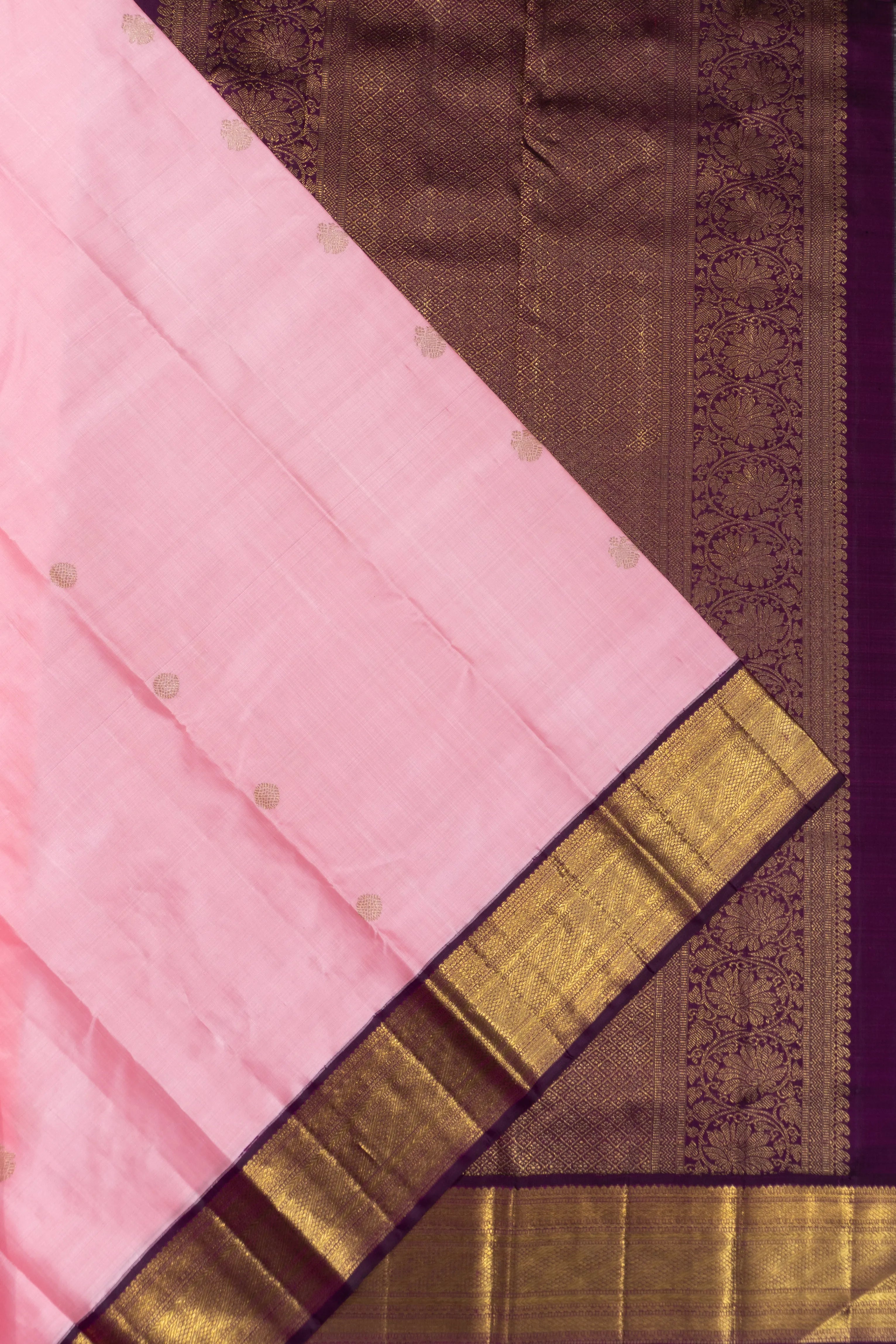 Adorn yourself in the exquisite grace of the Kanchipuram Silk Butta Baby Pink Saree, a masterpiece of traditional artistry The saree's body is adorned with gold zari floral and gandabharunda motifs, offering a touch of heritage and luxury that dances with every movement