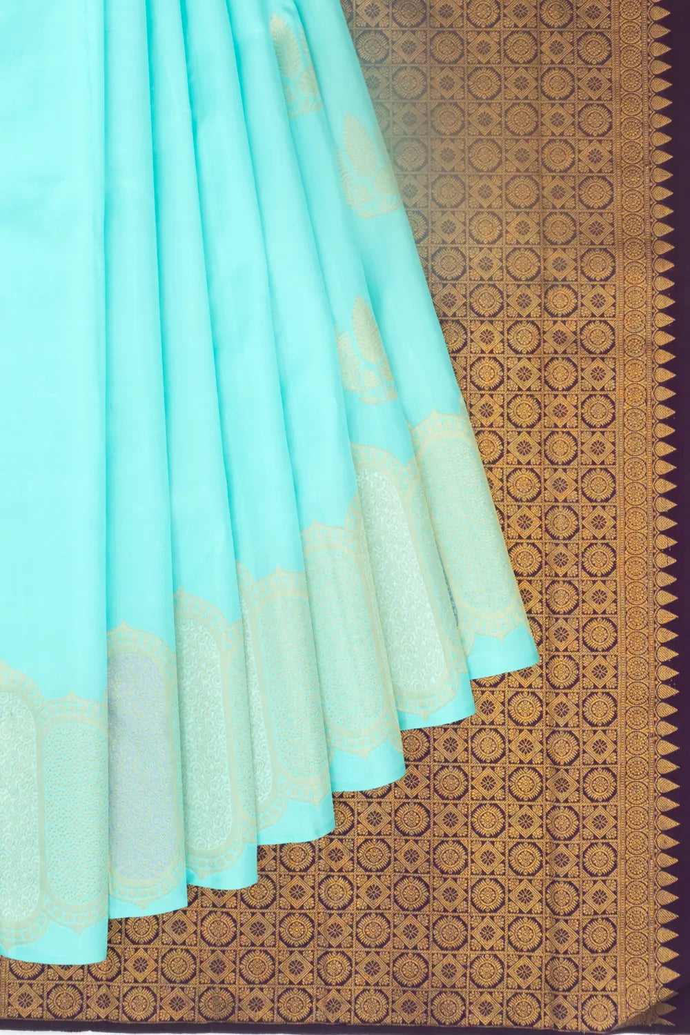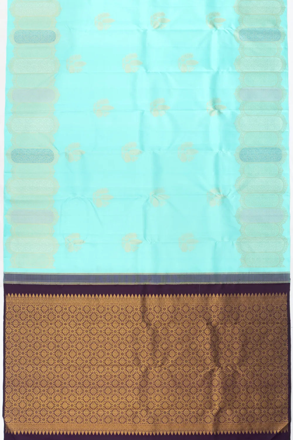 A stunning sky blue Kanchipuram silk saree intricately woven with gold zari floral buttas, embodying timeless beauty.