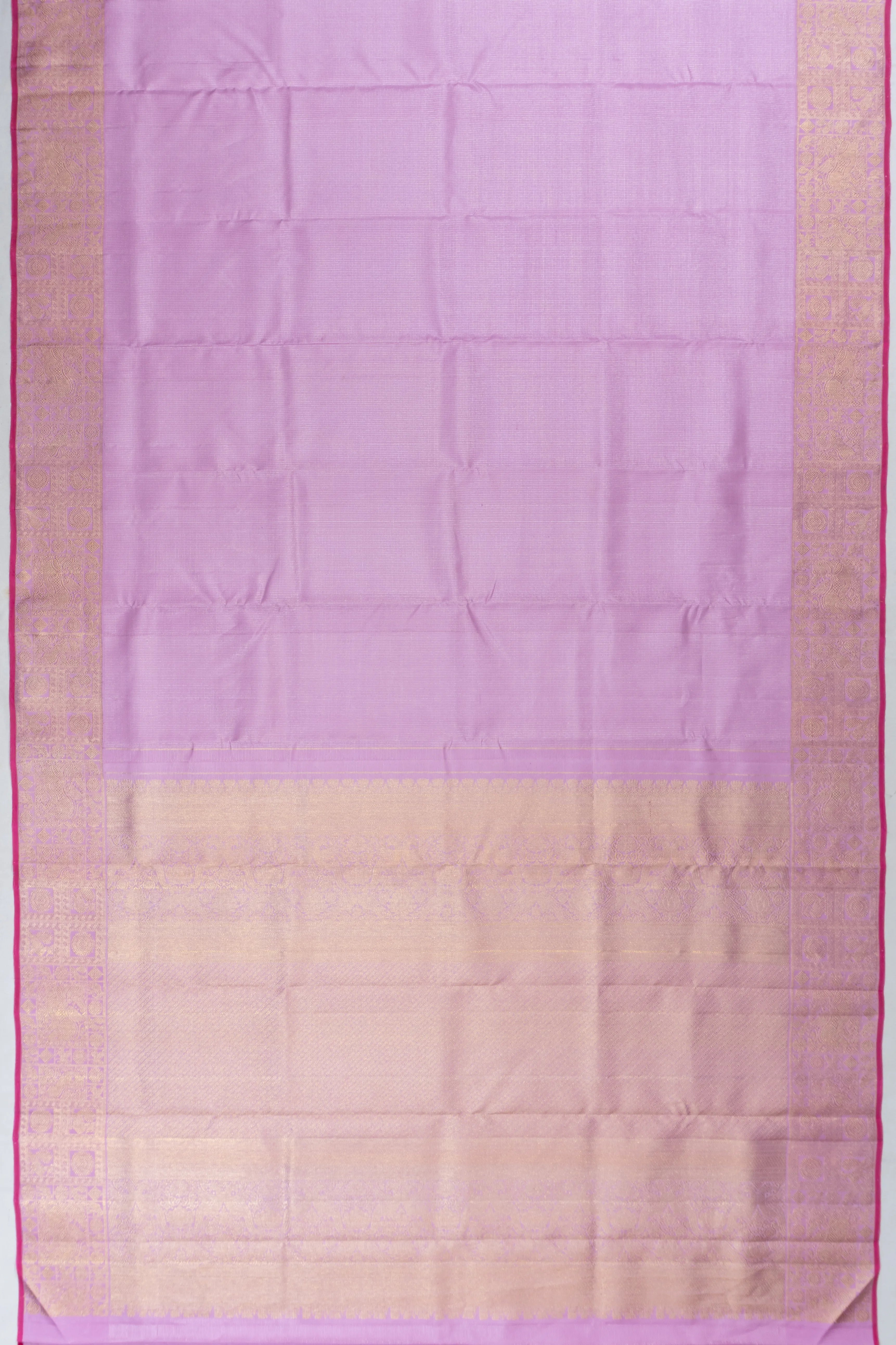 The saree's border is a delightful showcase of artistry, featuring self gold zari yali, peacock, and unicorn motifs nestled within a floral small border, accented with a delicate pink edge