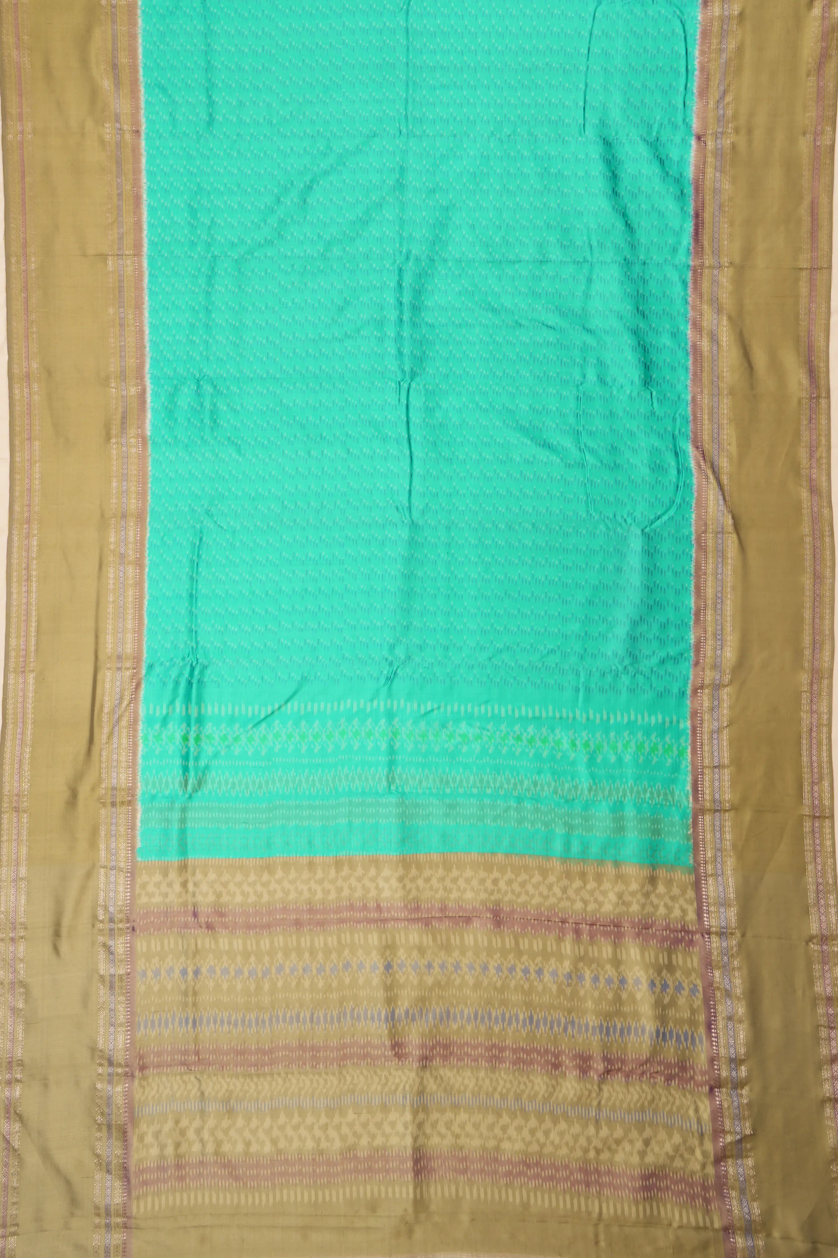 A contrast mehendi green rettai pattu border in gold zari brocade brings regal texture and structure.