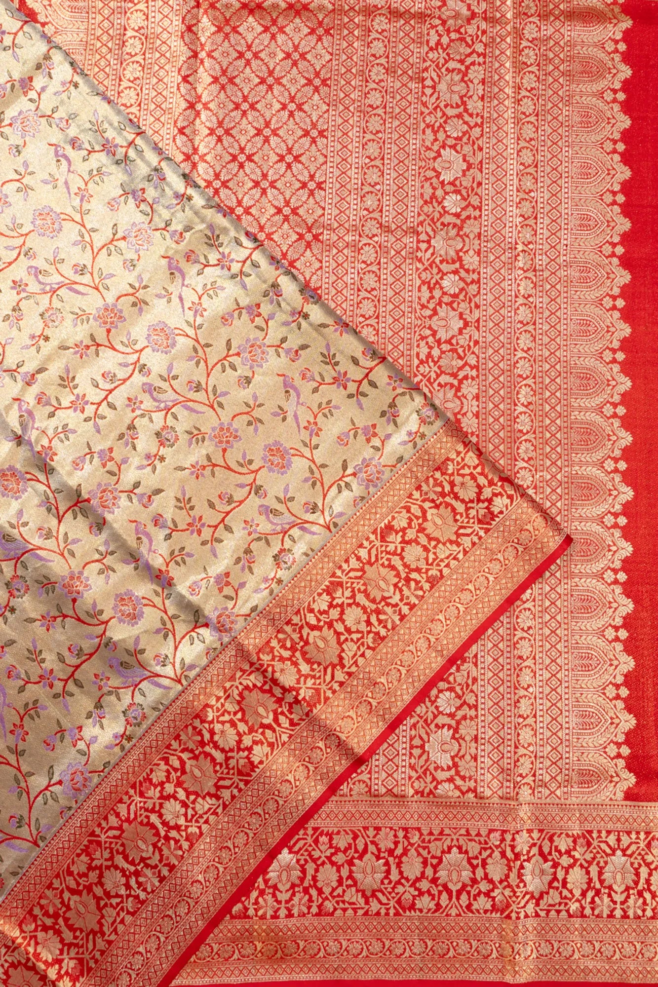A striking red medium border, enriched with gold zari floral brocade and delicate floral vines, enhances the saree's allure