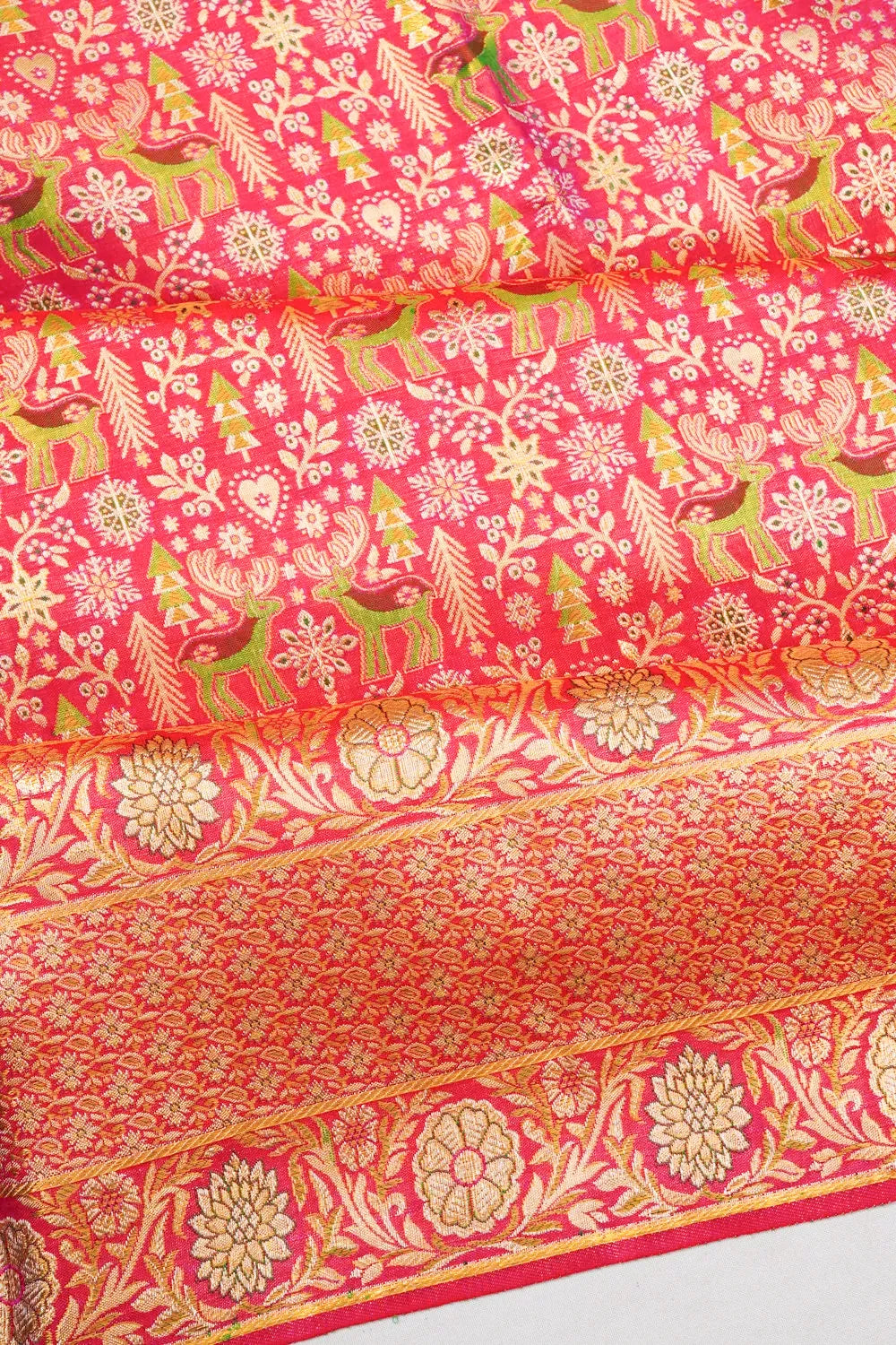 The body is adorned with gold and silver zari floral brocade, beautifully interspersed with delicate deer motifs, creating a visual symphony of nature-inspired artistry
