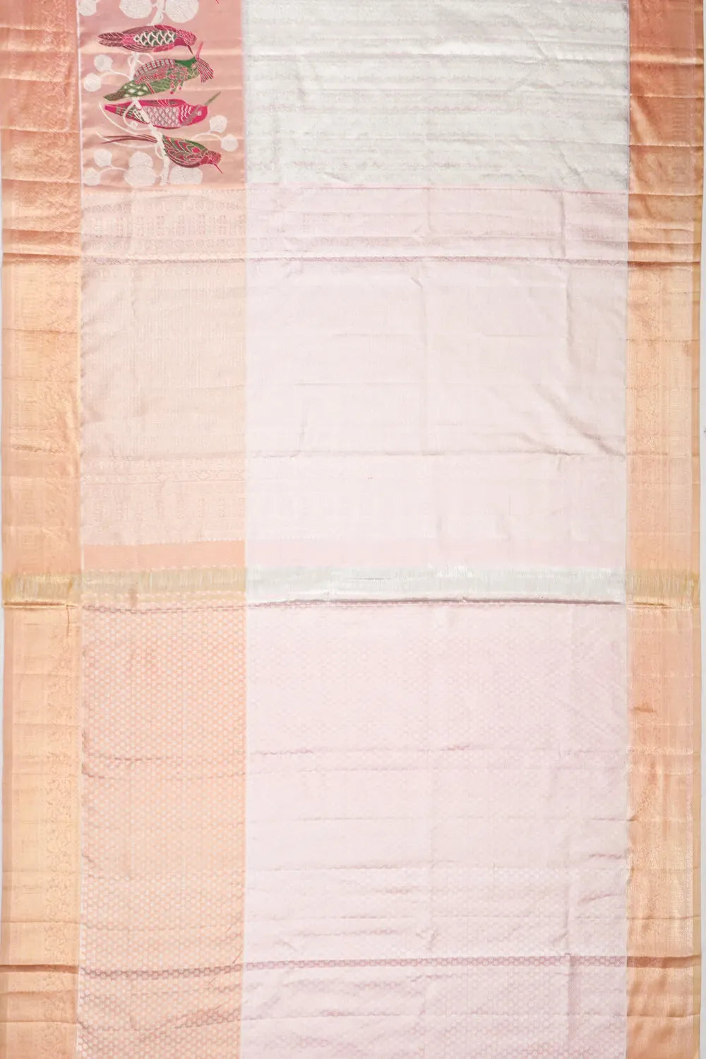 Adorn yourself in the graceful allure of our Kanchipuram Silk Tissue Brocade Silver Saree, a testament to the rich heritage of traditional Indian craftsmanship The silver zari tissue brocade is beautifully enhanced with glistening gold zari tissue, set against a backdrop of intricate bird motifs nestled within floral vines on the pleats