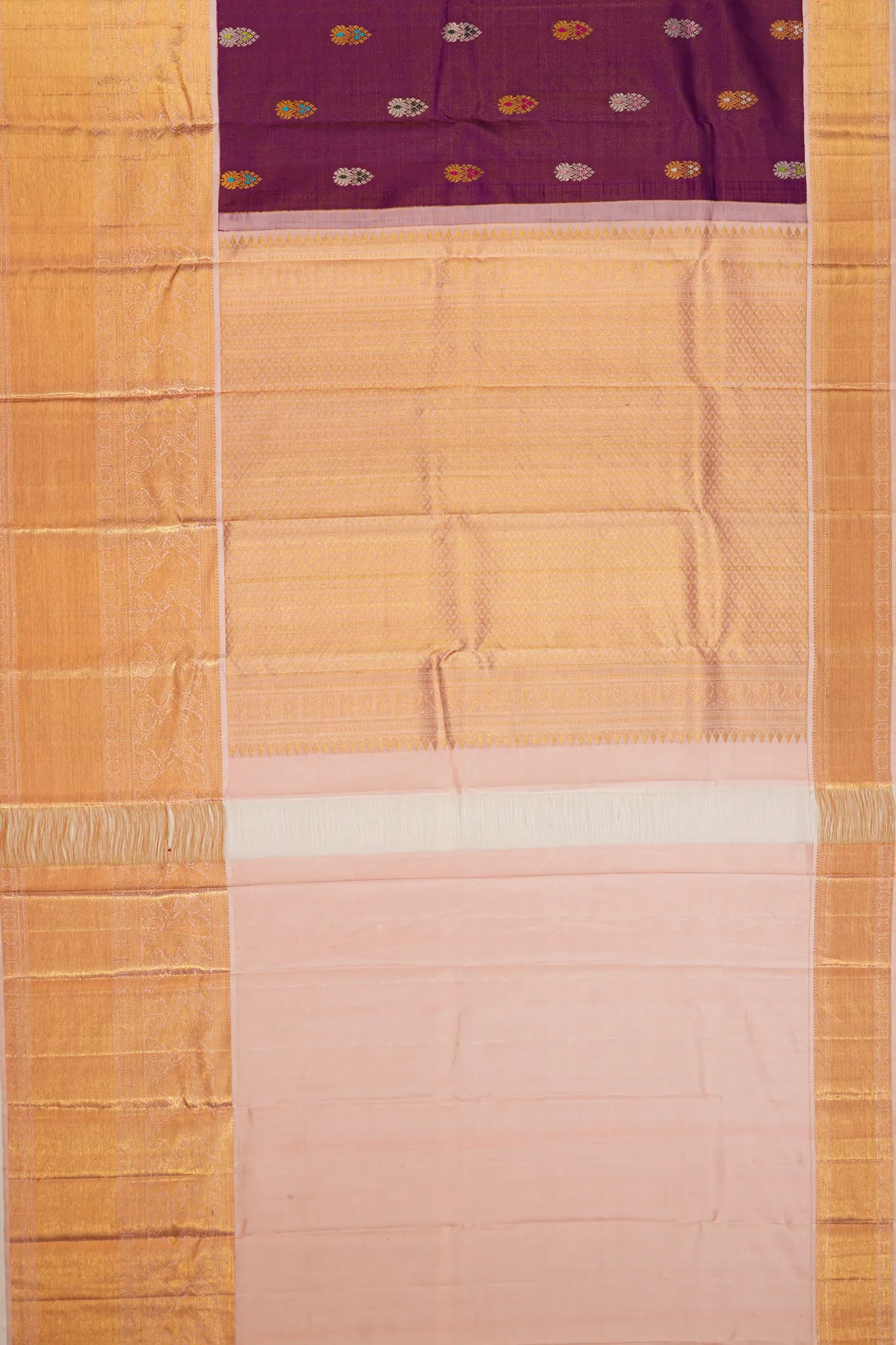 Embrace the allure of tradition with this Kanchipuram Silk Tissue Butta Purple Saree, a masterpiece of exquisite craftsmanship The saree's body is adorned with gold and silver zari floral buttas, set against a backdrop of luxurious gold zari tissue, exuding an aura of grace and opulence