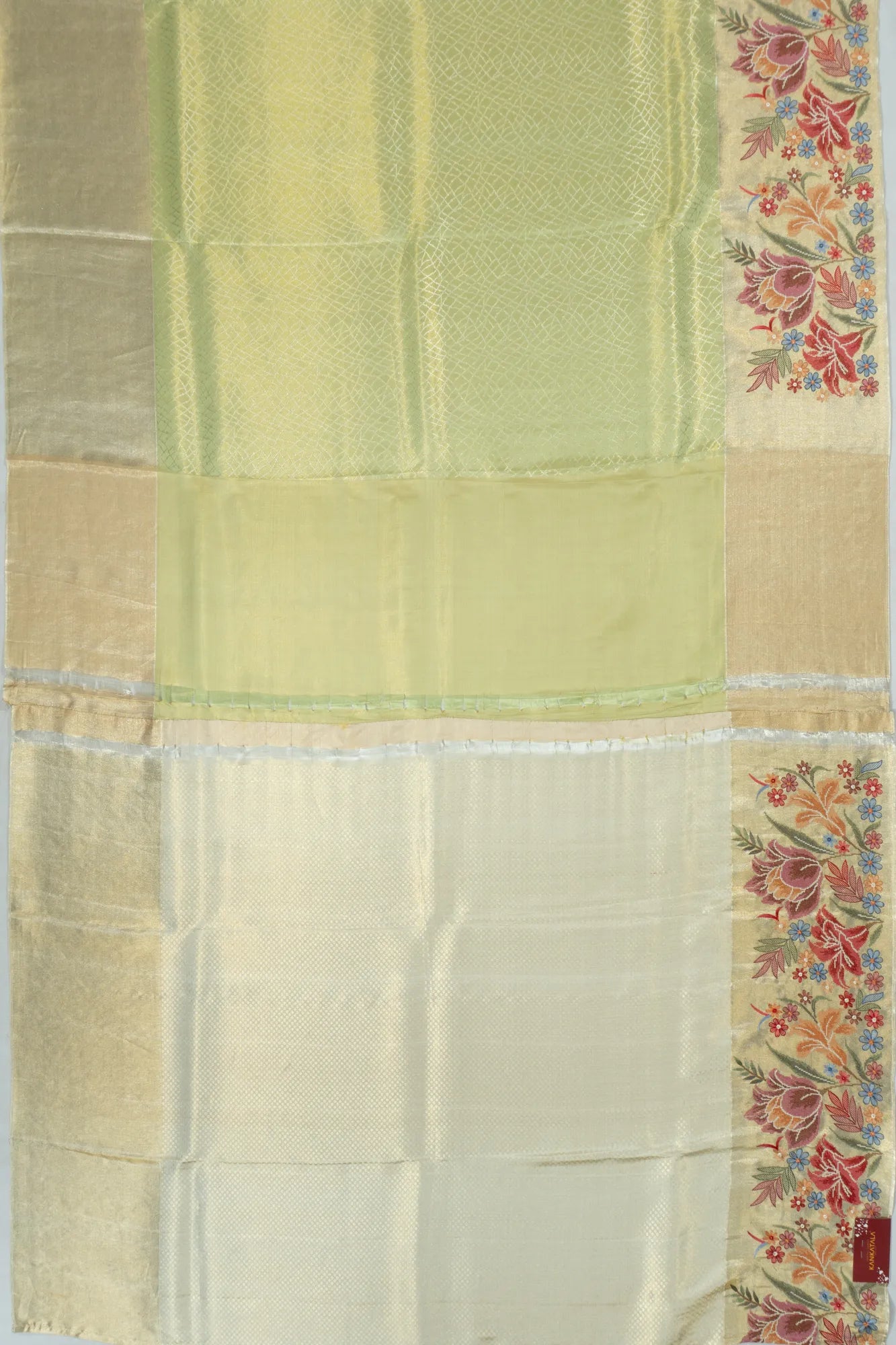 The pallu enchants with its silver zari floral brocade and graceful floral paisleys, enhancing the saree timeless charm
