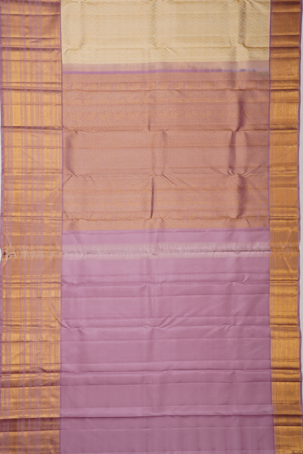A sophisticated contrast gold zari lavender border adds a touch of opulence, creating a harmonious blend of colors that elevates the saree's allure
