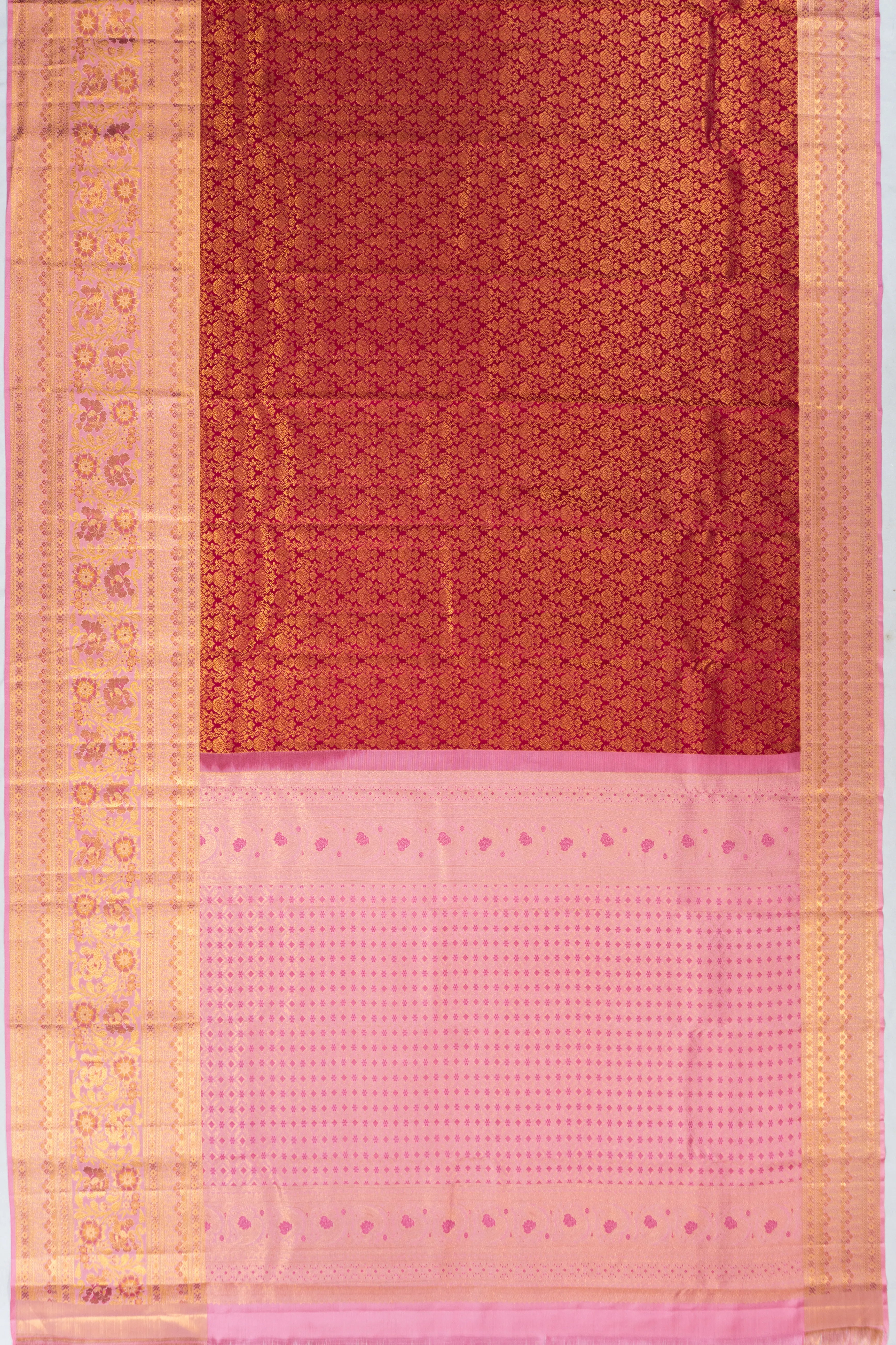 Accompanied by a complementary baby pink blouse, featuring gold zari floral brocade and elegant zari borders, this saree offers a cohesive and refined ensemble