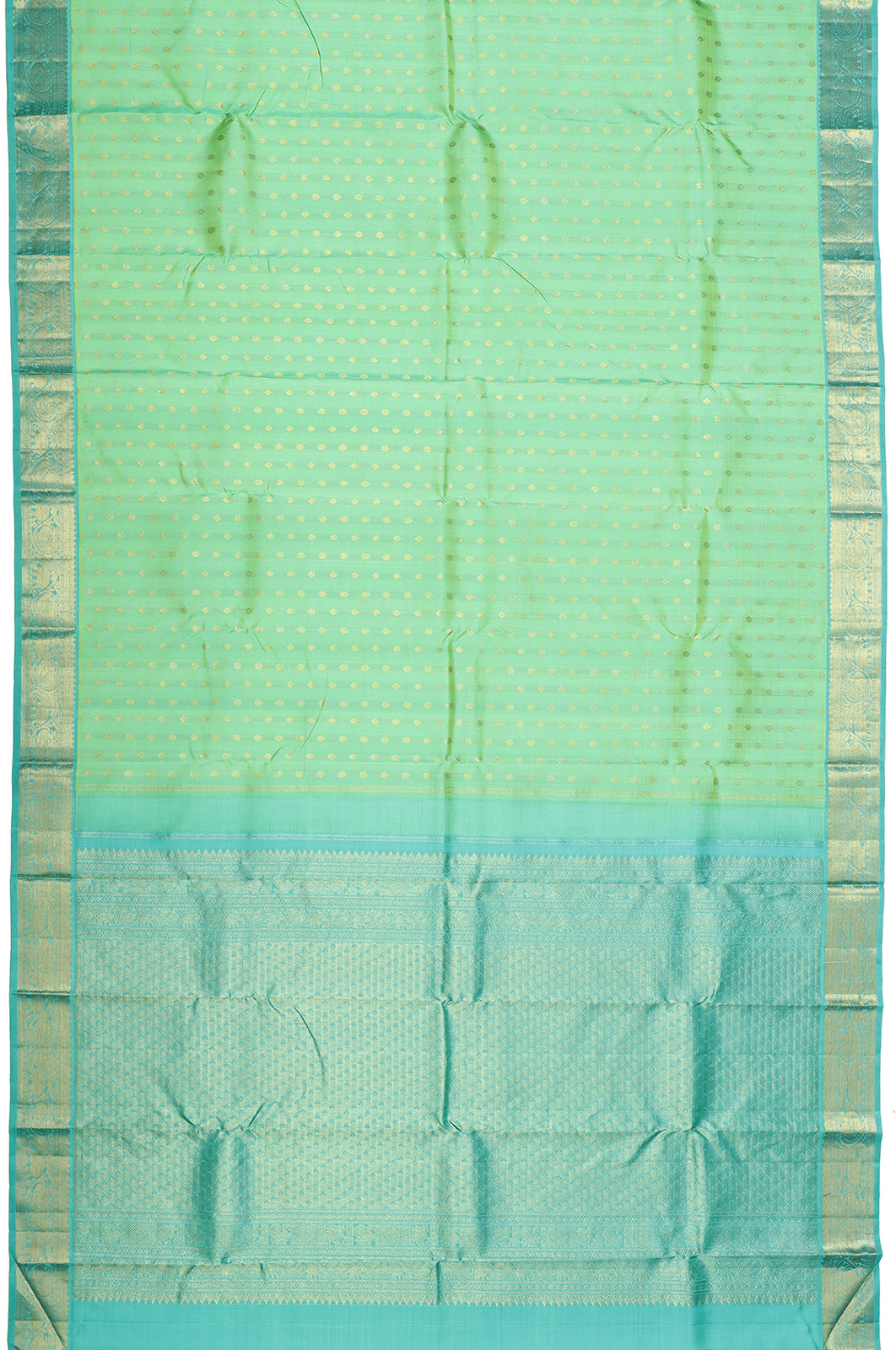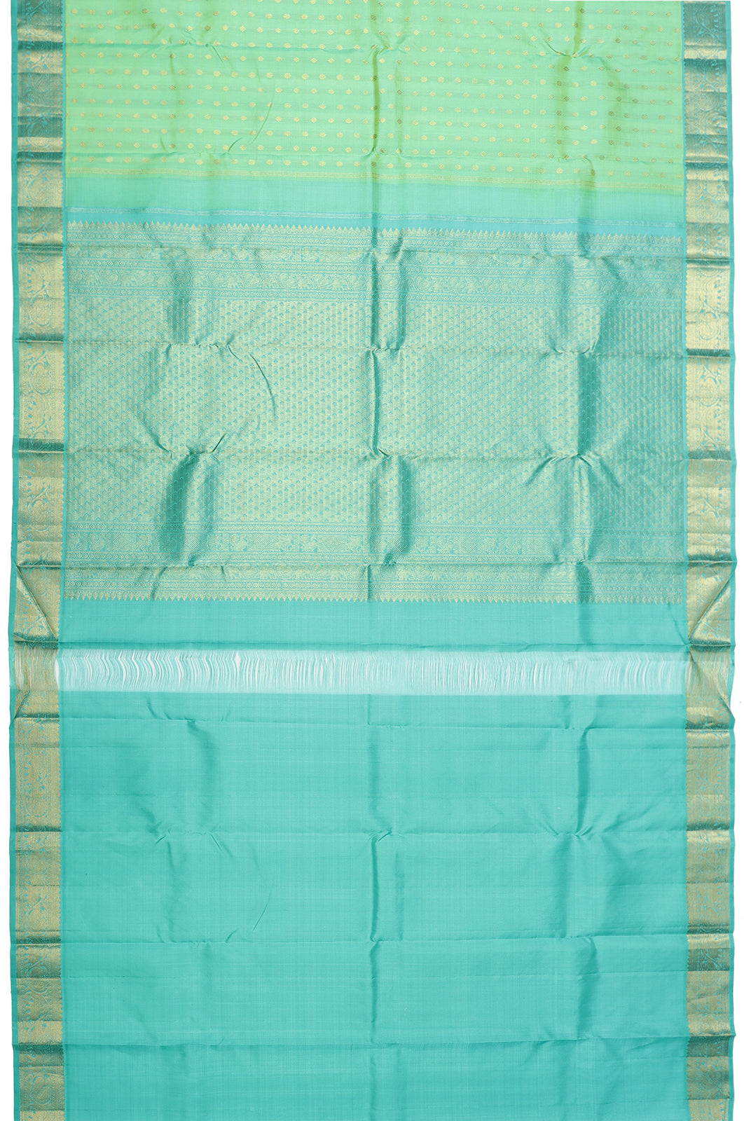 The lush green body is adorned with gold zari floral buttas, creating a splendid tapestry of timeless beauty