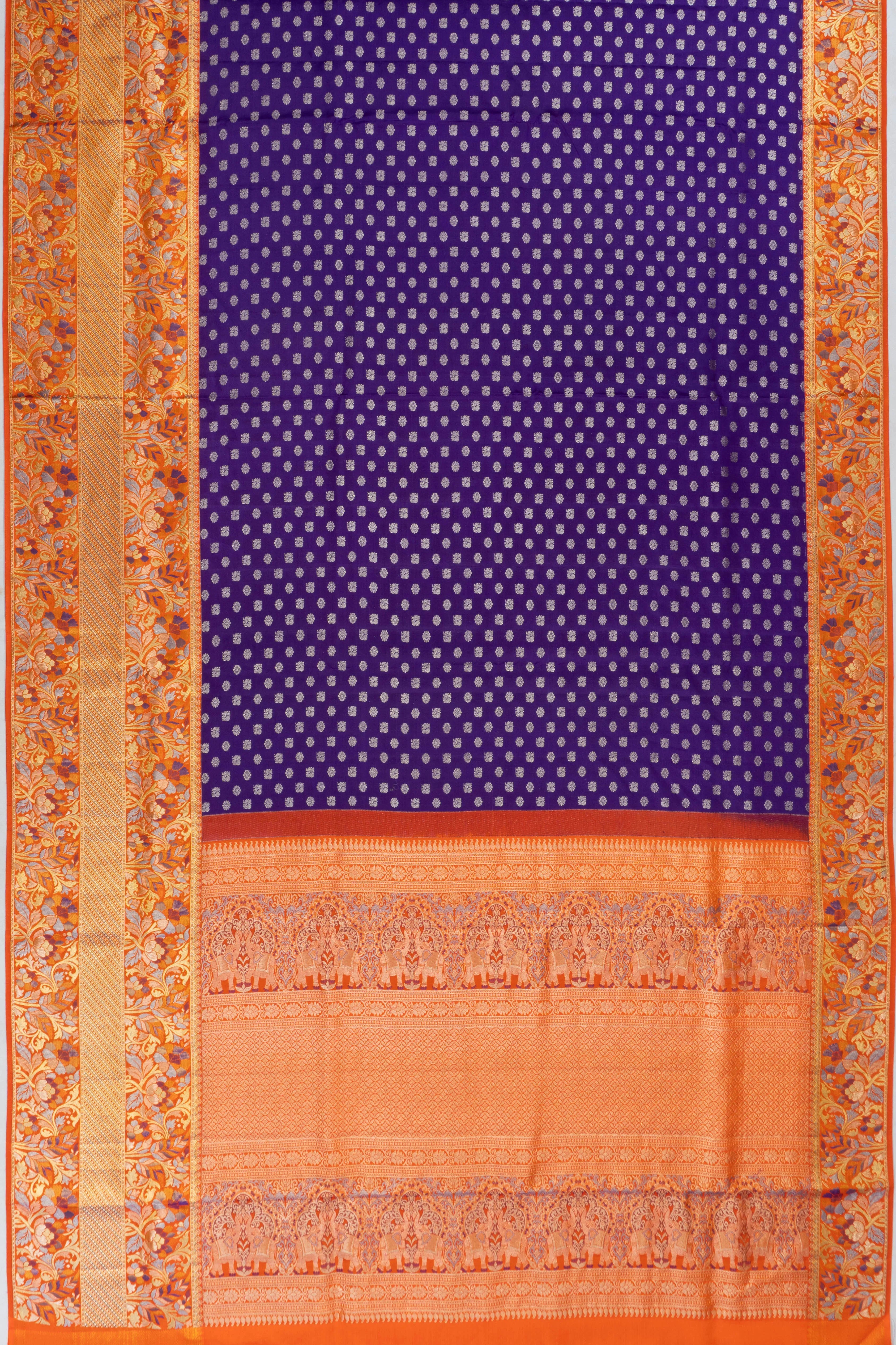 The saree's design is elevated by a striking orange medium border, featuring contrast gold zari tissue with floral brocade that offers a harmonious blend of color and artistry