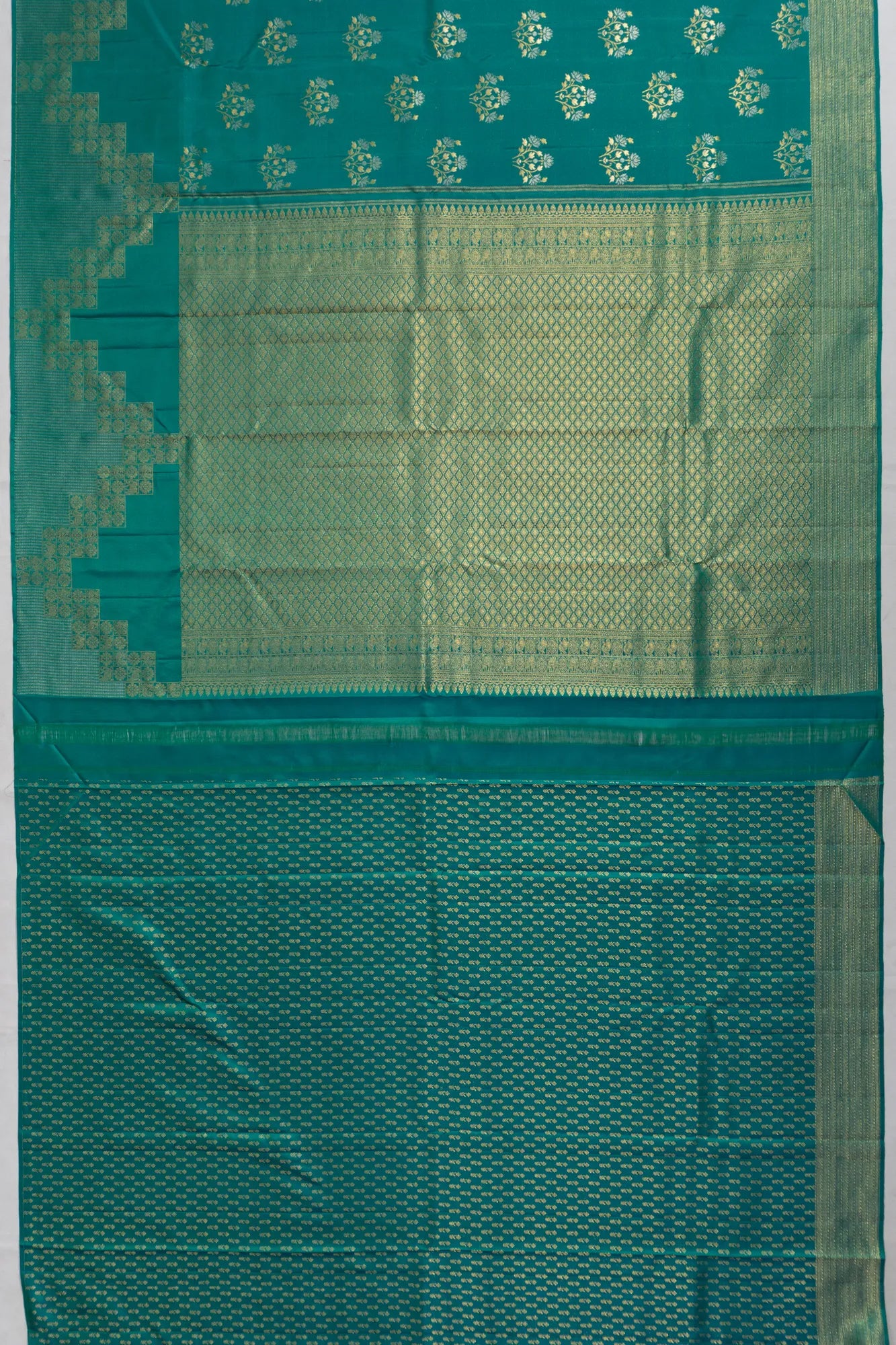 This saree is a testament to the fine artistry of gold and silver zari floral buttas that adorn the body, offering a touch of timeless sophistication