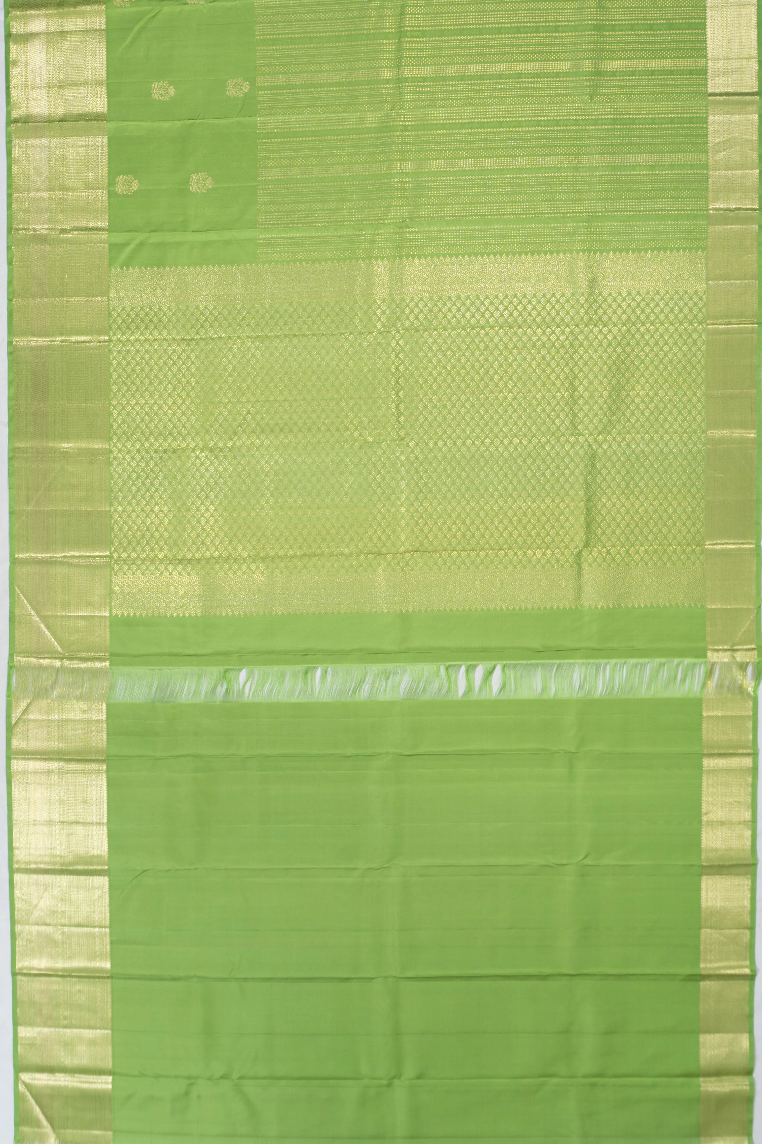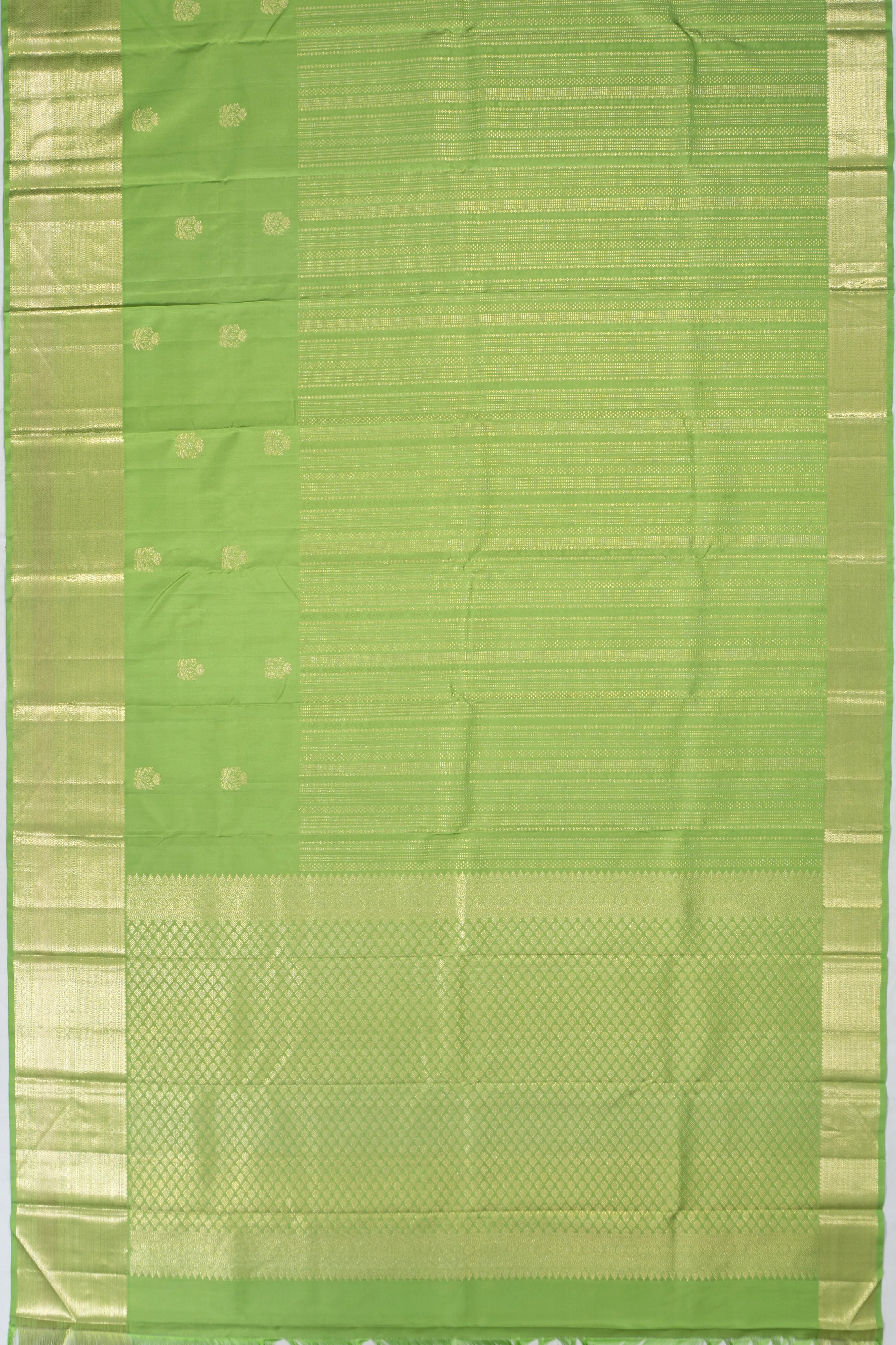 Embrace the essence of tradition with the Taranga Kanchi Silk Vertical Lines Green Saree, a masterpiece that exudes grace and heritage The saree's body is adorned with delicate gold zari vertical lines and floral buttas, adding a touch of elegance to its exquisite drape