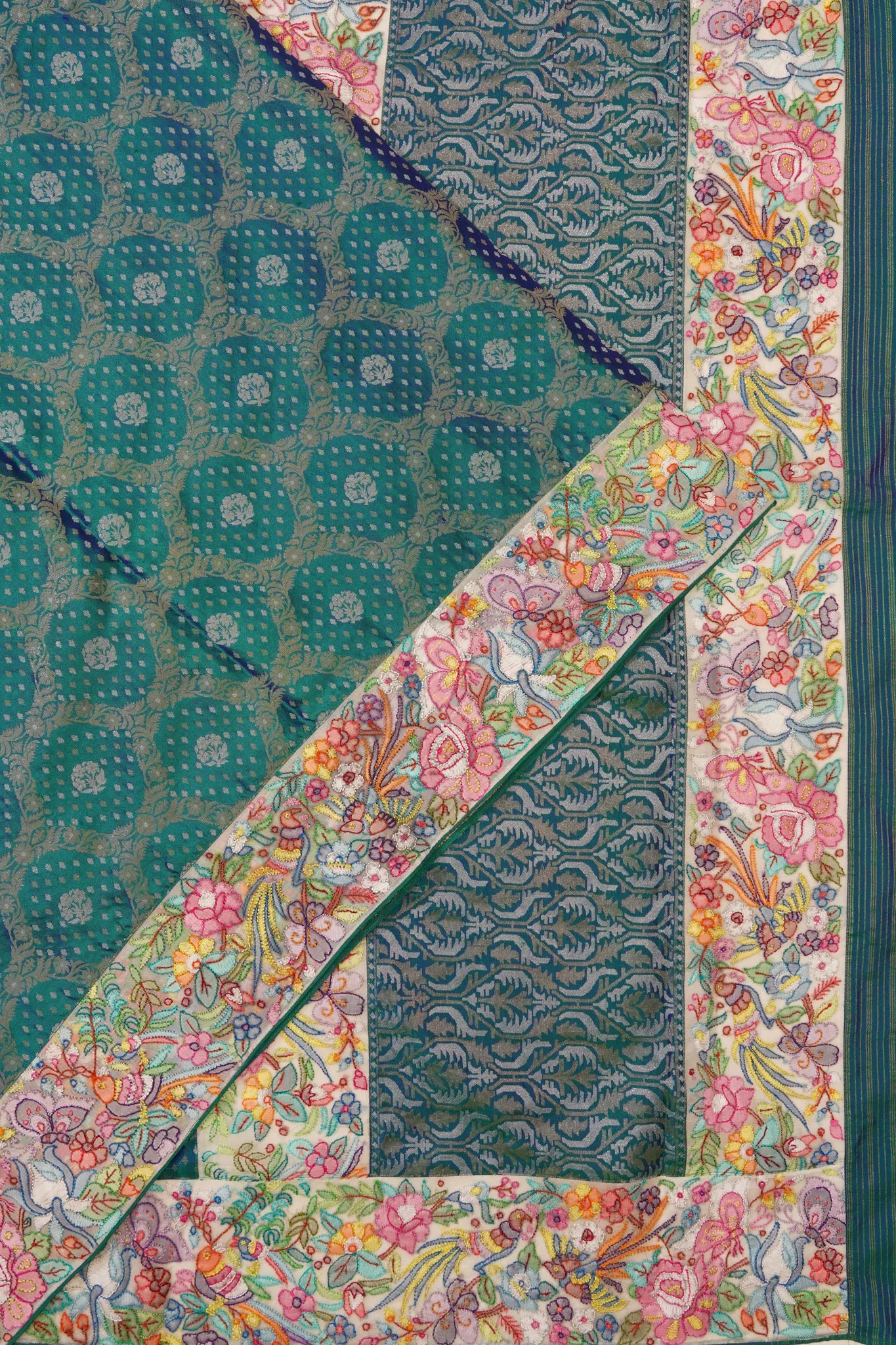 The saree's body captivates with gold and silver zari floral brocade, creating a stunning interplay of shimmering motifs that dance across the silk
