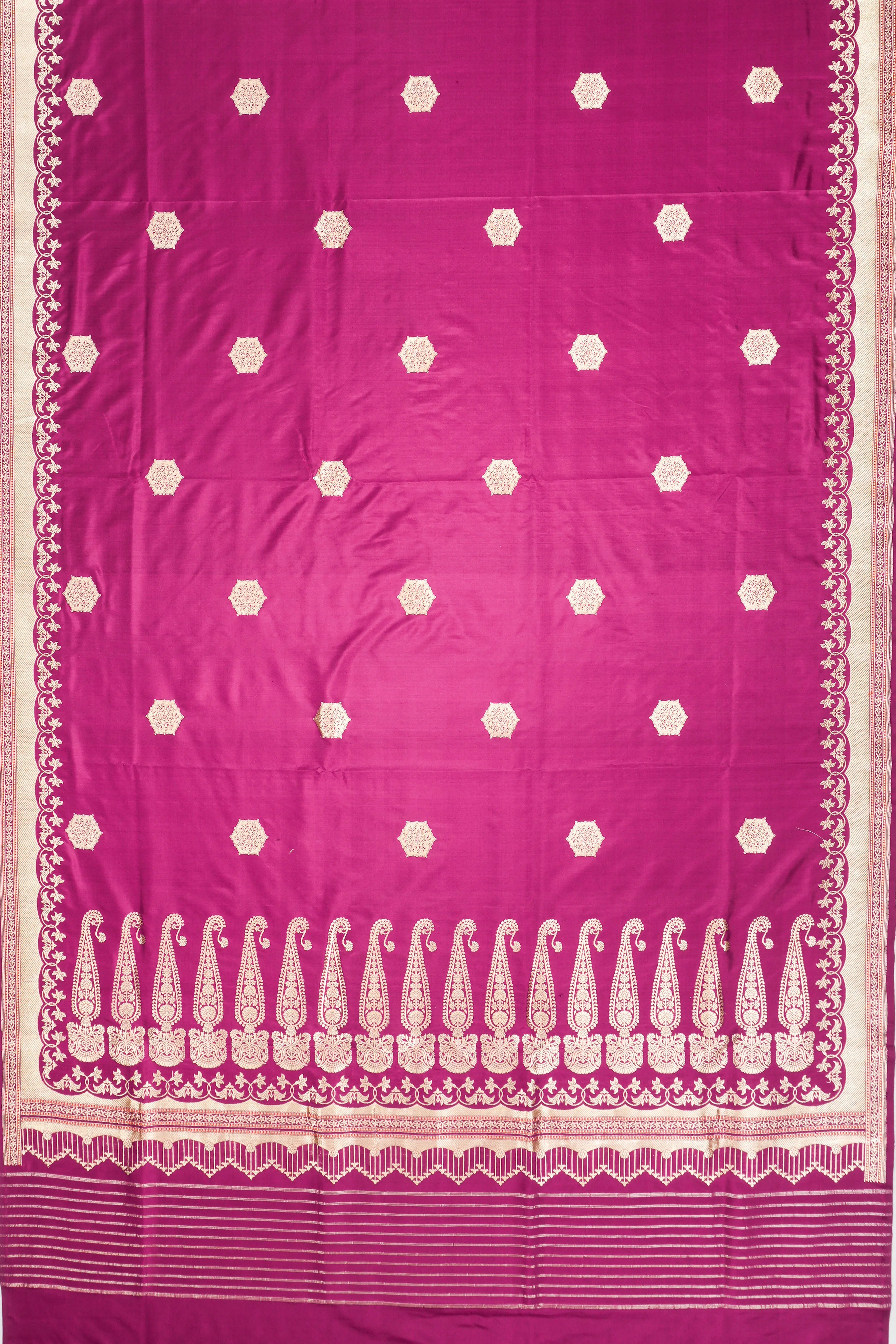 The body is adorned with delicate Kadwa Butta motifs, offering a graceful interplay of tradition and style, while the deep purple silk adds a touch of regal charm