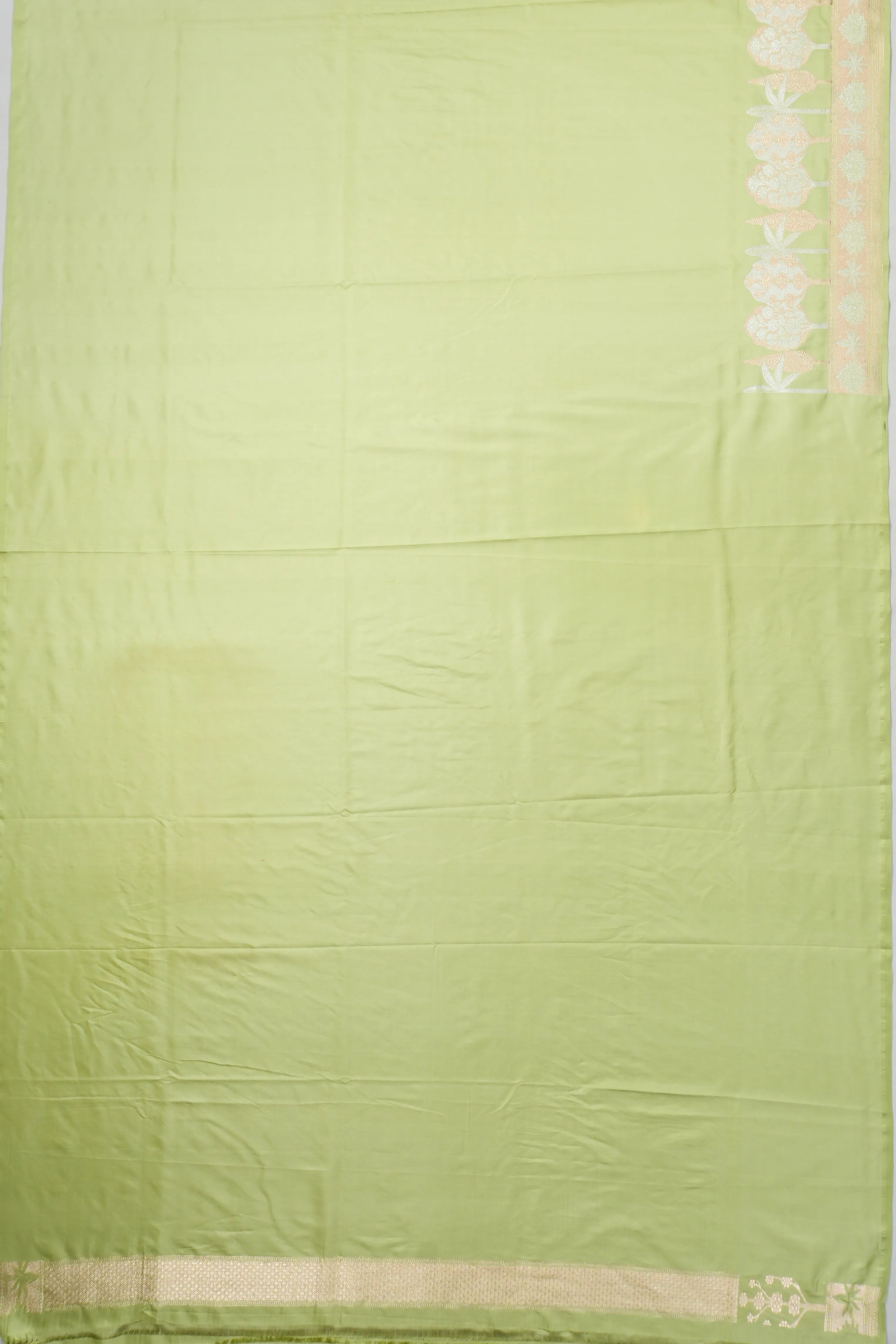 Its serene pista green body is adorned with gold and silver zari floral brocade on the pleats, offering a subtle yet luxurious touch