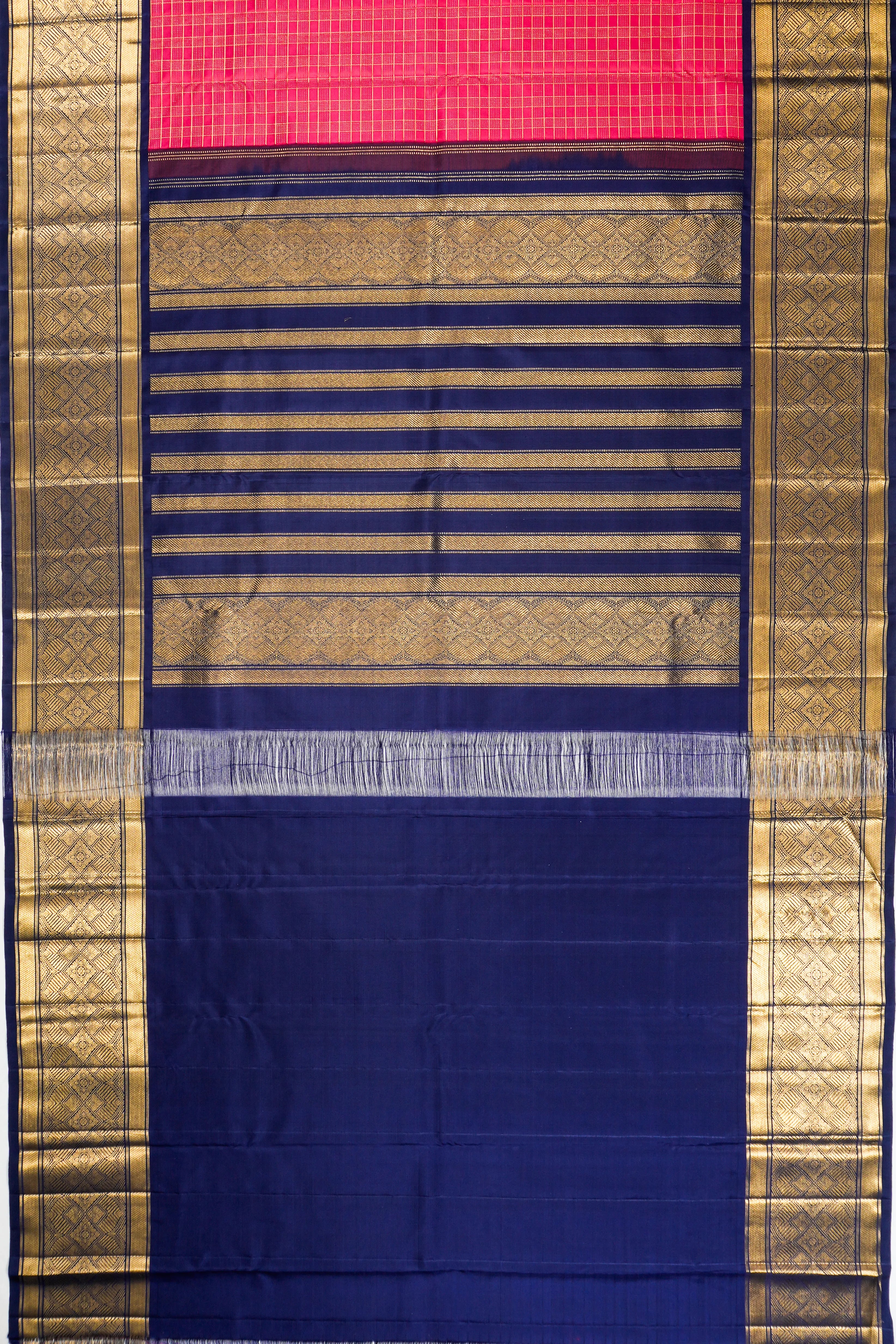 The body is adorned with gold zari checks, creating a delicate pattern that exudes elegance and grace with every fold